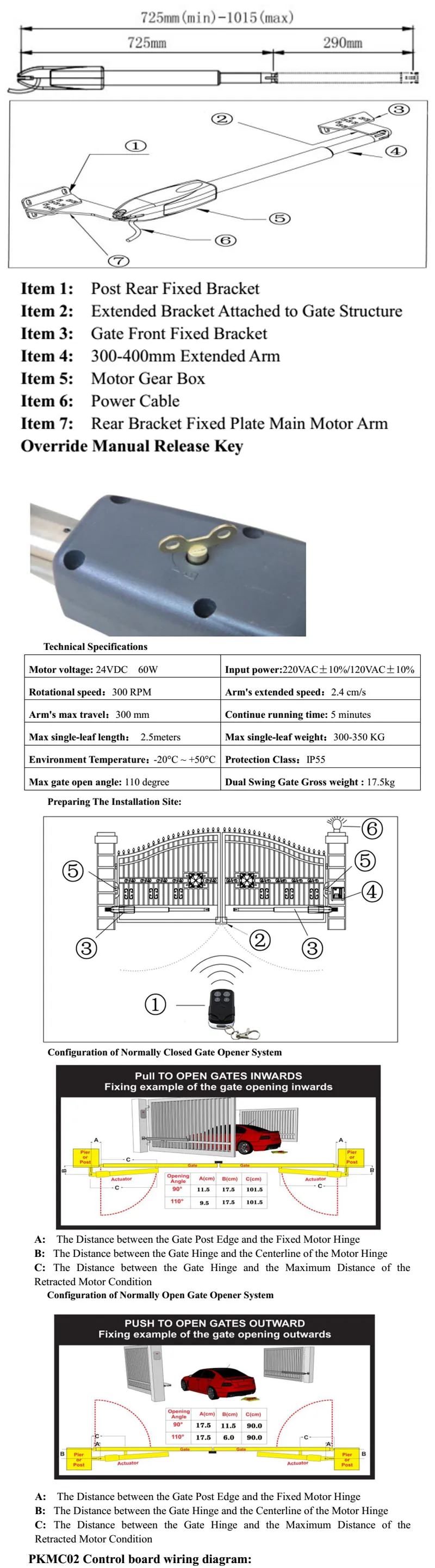 Технические характеристикиНапряжение двигателя: 24 В постоянного тока 60 ВтВходная мощность: AC/DC24V ± 10% / 220VAC ± 10% / 120VAC ± 10%Скорость вращения 300 об/минРасширенная вспышка 2,4 см/сМаксимальная ширина руки 300 ммВремя работы: 5 минутМакс одностворчатая длина 2,5 метровМакс. Однолистный weight300-400 кгТемпература окружающей среды-20 °C ~ + 50 °CЗащитная доска 55Максимальный угол открытия ворот: 110 градусовВес брутто: 18 кг