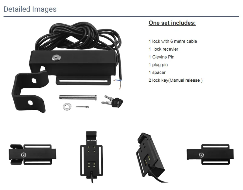 Один комплект включает в себя:1 замок с 6 м кабель1 блокировщик1 шпилька1 штепсельная вилка1 прокладка2 ключа замка (ручной выпуск)