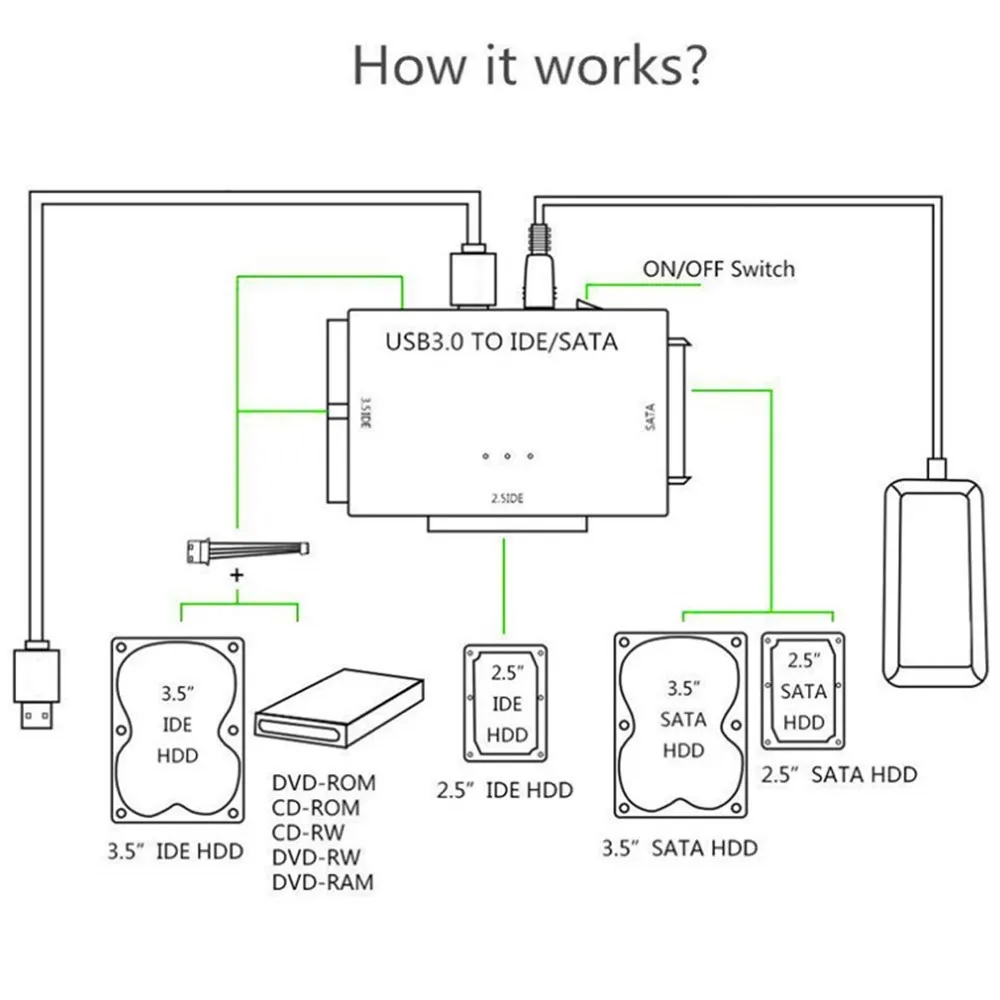 2. Этот адаптер SATA/IDE К usb поддерживает скорость передачи до 5 Гбит/с-фактическая скорость передачи ограничена настройкой подключенного устройства; Вниз совместим с USB 1,1/2,0