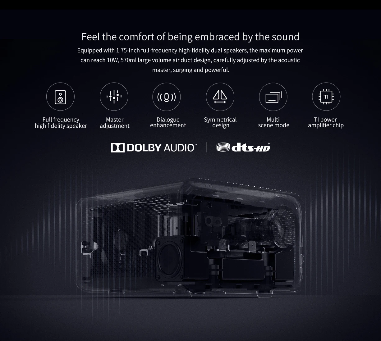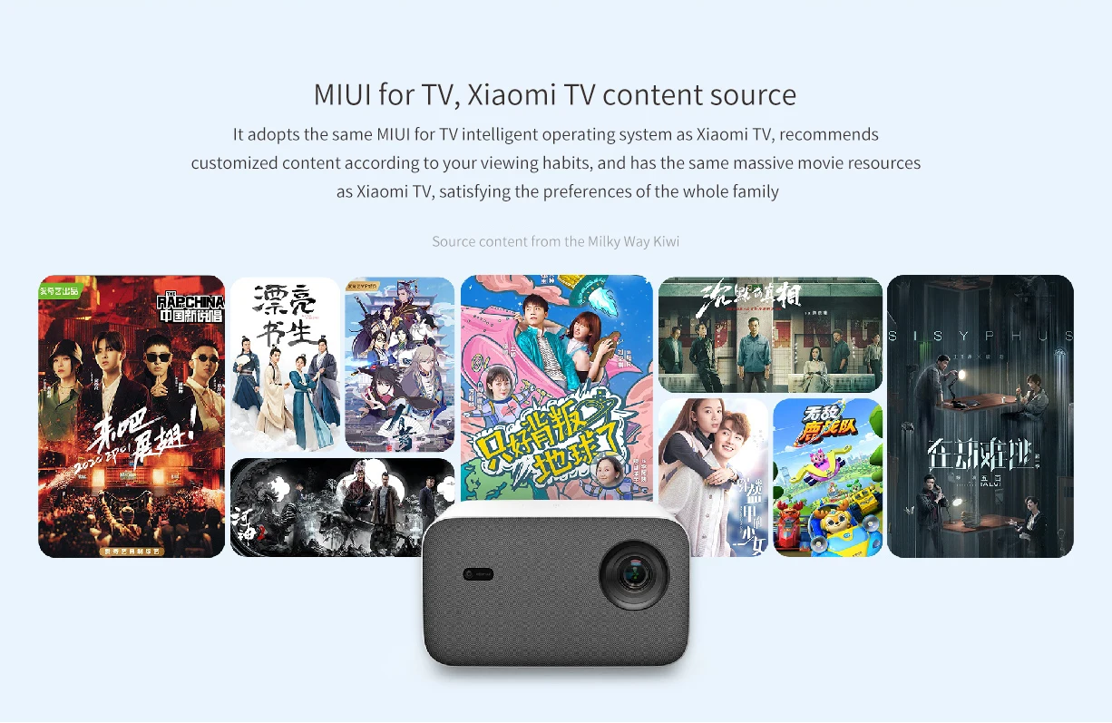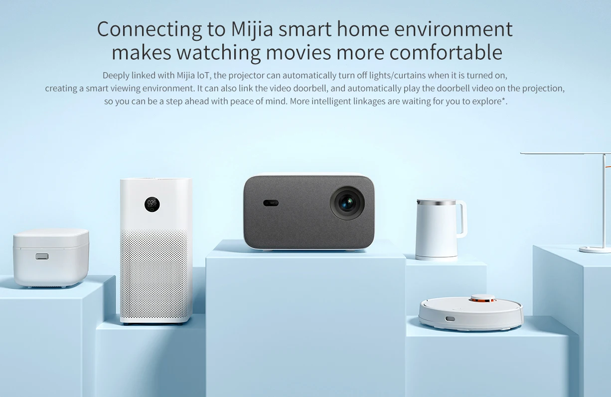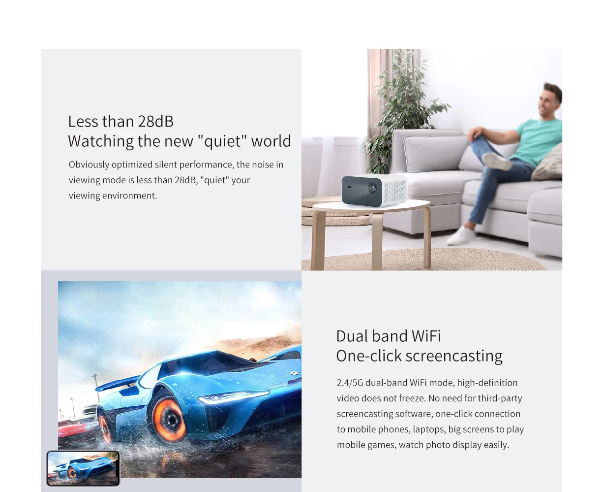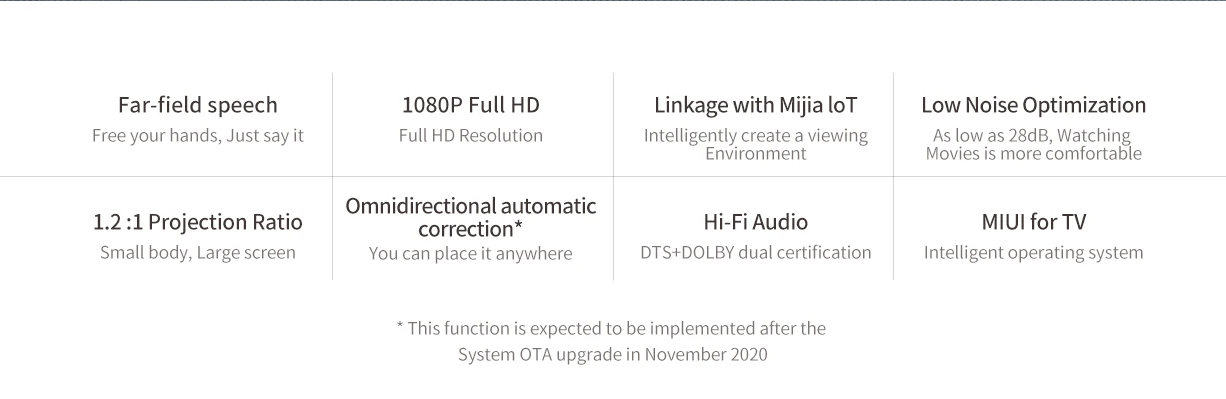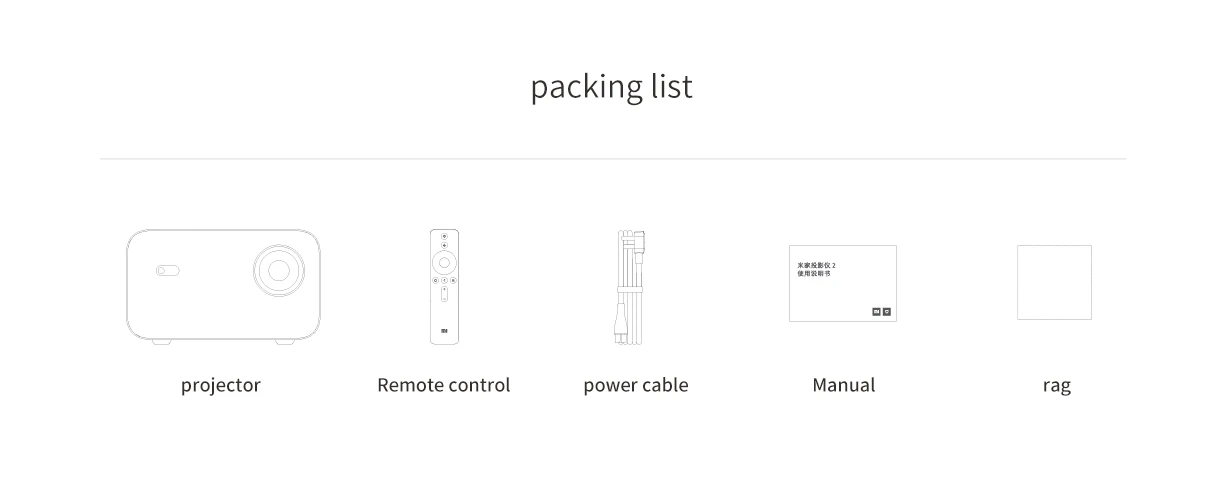 Название продукта: Mijia Projector 2Цвет корпуса: белыйМатериал: Поликарбонат + пластикРазмер продукта: 220mmX200mmX128mmВес нетто: 3,1 кгФокус объектива: неиндуктивный фокусСоотношение дисплея: 16:9Истинная Яркость: 800ANSI люменСтандартное разрешение: 1920X1080Светильник-источник: светодиодныйТехнология отображения: DLPКоэффициент проекции: 1,2 (см. Фактический)Размер экрана: 60 ~ 120 ",Трапециевидная коррекция: вертикальная ± 40 °, горизонтальная ± 40 °Процессор: Amlogic T972-HОперативная память: 2 ГБ DDR3Встроенная память: высокоскоростная флэш-память eMMC 16 ГбПульт дистанционного управления: голосовое управление BluetoothОперационная система: MIUI TVРежим яркости: просмотр в офисе и киноBluetooth: Bluetooth 4,2/BLE низкое энергопотреблениеЗвуковые эффекты: Dolby Audio, DTS-HDВстроенный источник питания: Встроенный AC-DCДинамик: двойная 10 Вт Полная частотаИнтеллектуальный Контроль температуры: Автоматическое Переключение режима яркости и интеллектуальная Регулировка вращения вентилятораСветильник индикатора: Белый светодиодныйМощность Входное напряжение: 100-240V ~ 2.5a 50/60HzПотребляемая мощность: < 220 ВтШум: ≤ 28 дБ (A) режим просмотра при температуре кольца 25 °CРабочая температура: 0 °C ~ 40 °CСетевой интерфейс: кнопка Ethernet X1
