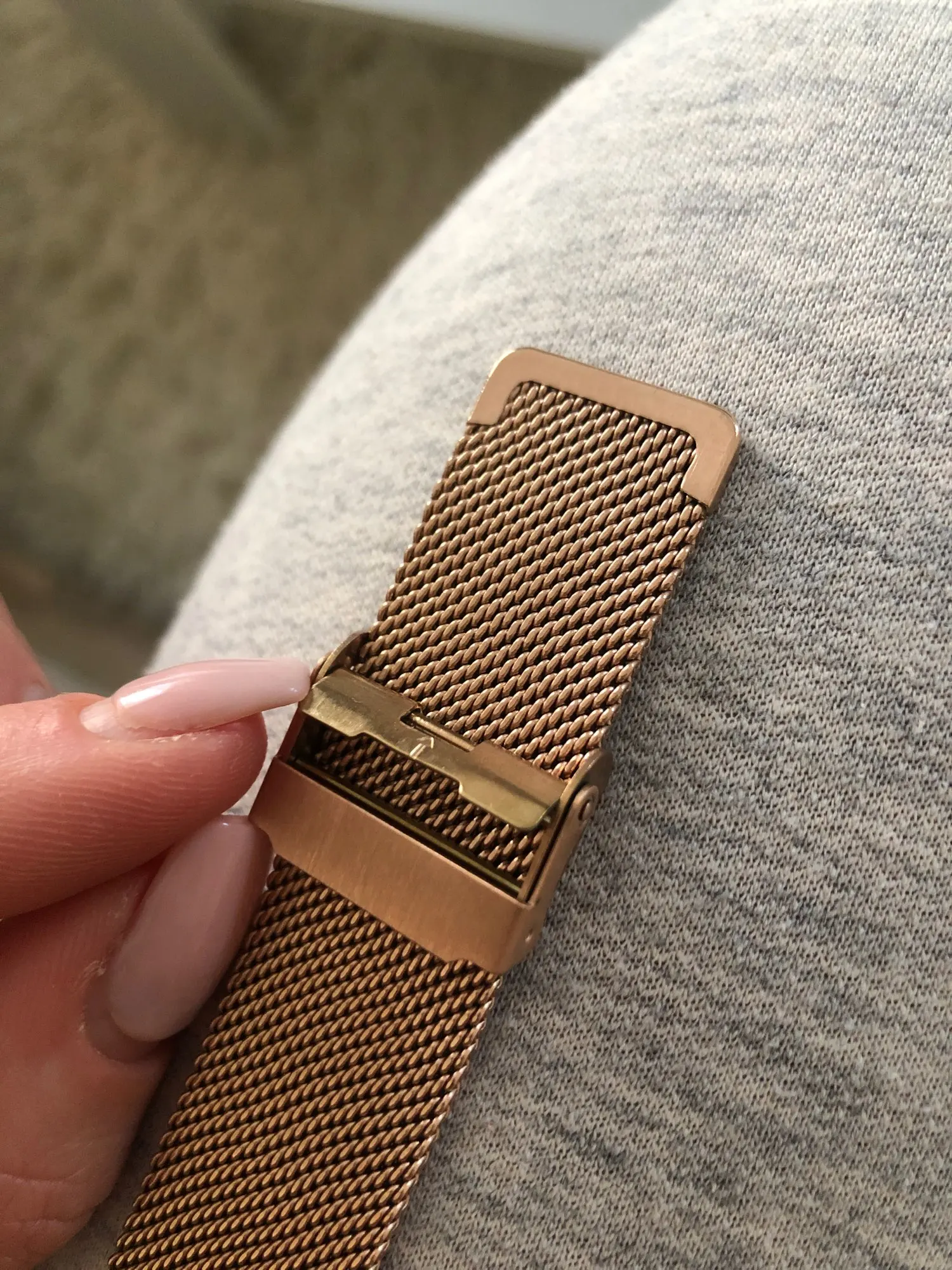 Застежка крепкая, выглядит добротно, не очень красивое соединение с часами, а также периодически вырывает волосы на руке.