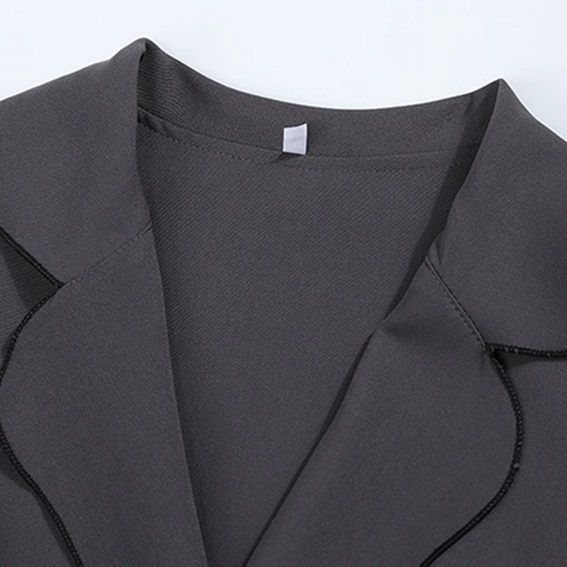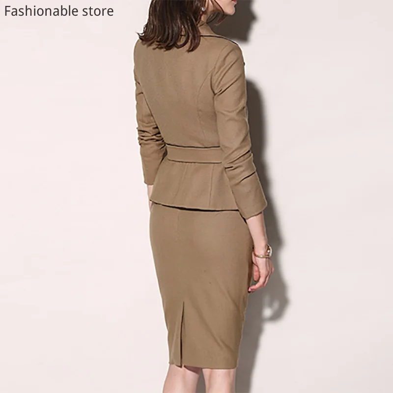 Женский однотонный двубортный блейзер с лацканами и юбка миди с узлом