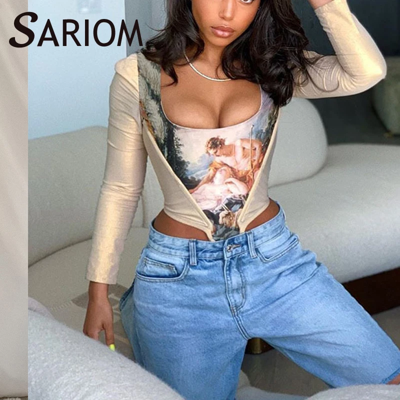 Женский корсет с длинным рукавом, футболка с квадратным воротником и принтом ангела, одежда для ночного клуба, осень 2020