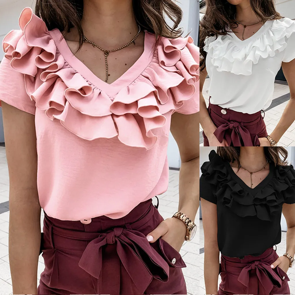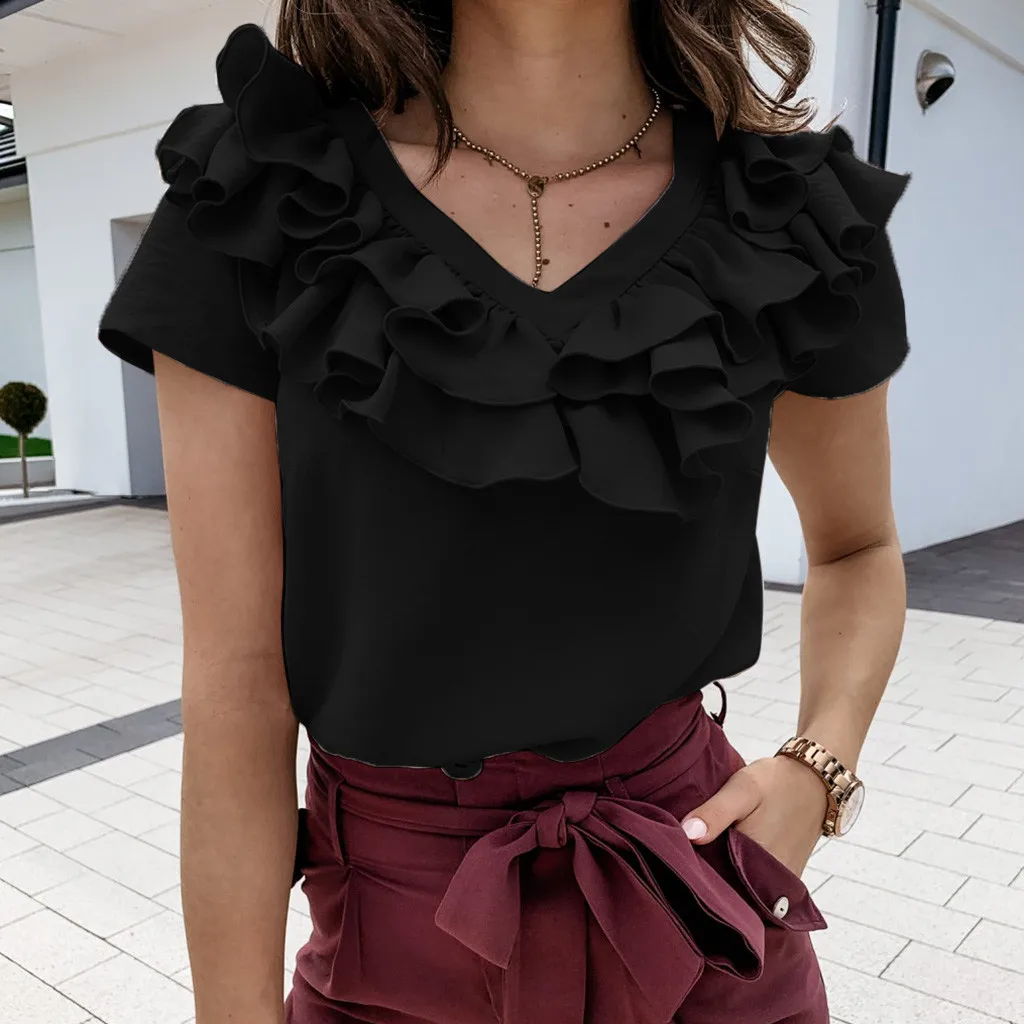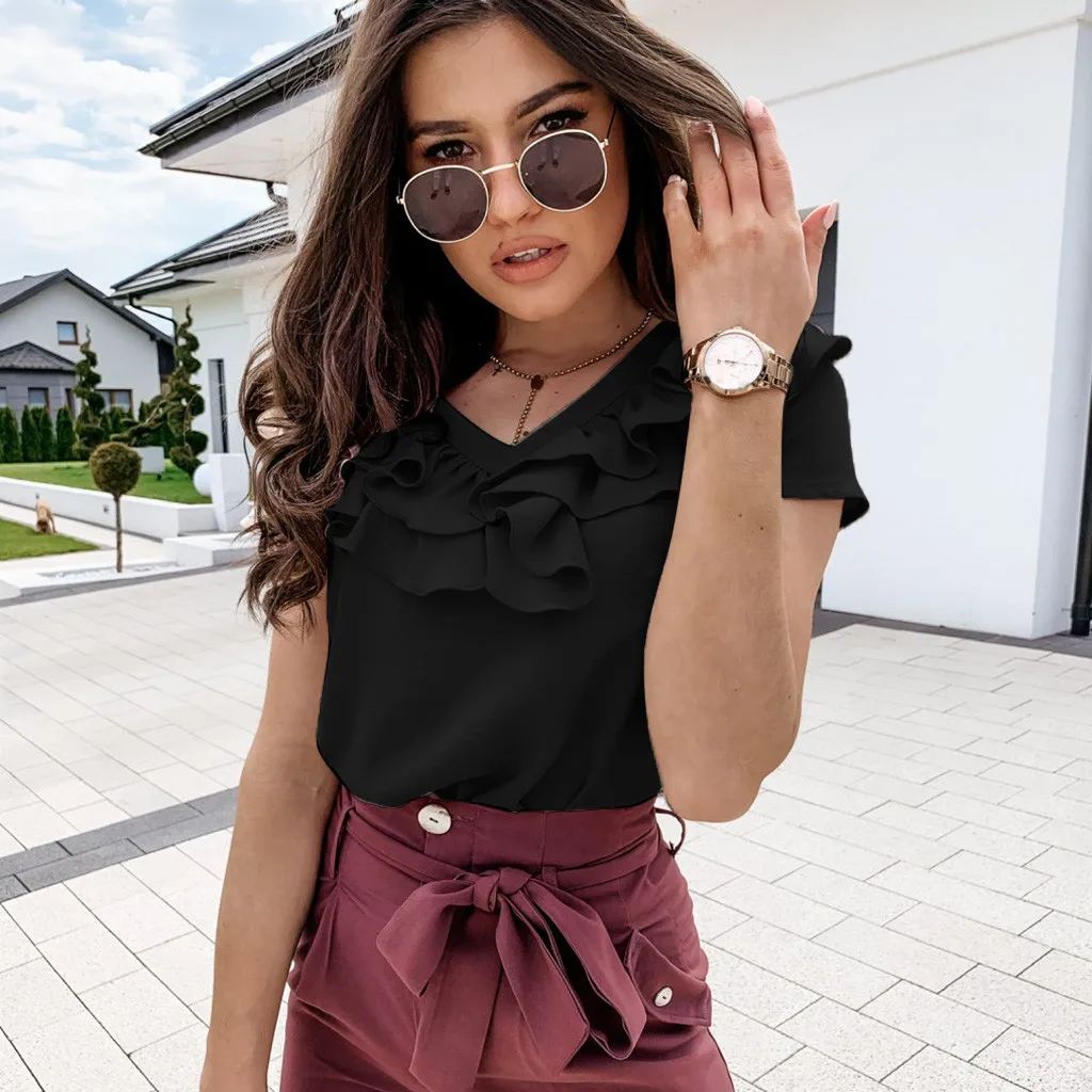 3. V-образный вырез с оборками Шея,КороткийРукав, Твердый, Натяжная застежка. A Базовый Топ с небольшой яркостью, sНе модно. Он имеет идеальную длину, чтобы вы могли использовать его в своих штанах или шортах.