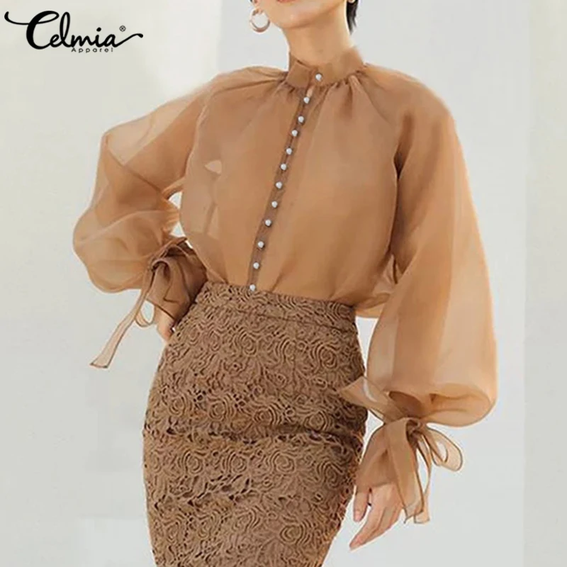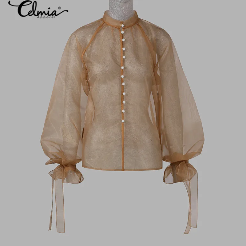 Стильные женские блузки Celmia, сексуальные прозрачные сетчатые топы, прозрачные женские пуговицы с длинным рукавом для рубашек, повседневные блузки