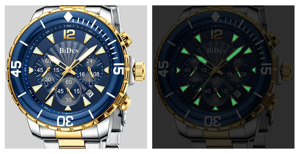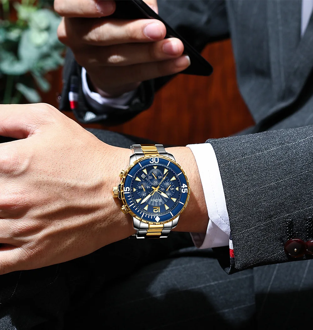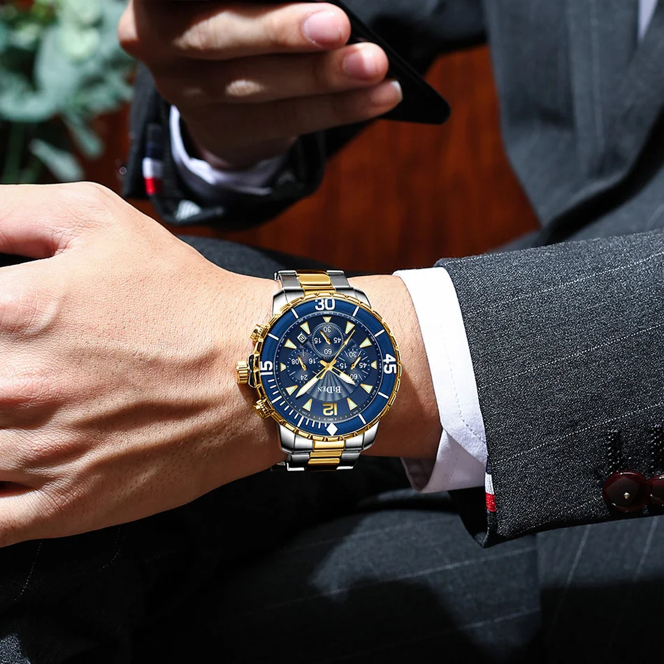 Часы наручные мужские с хронографом, люксовые деловые модные повседневные Брендовые с ночным светильник льником, золотистые синие из нержавеющей стали