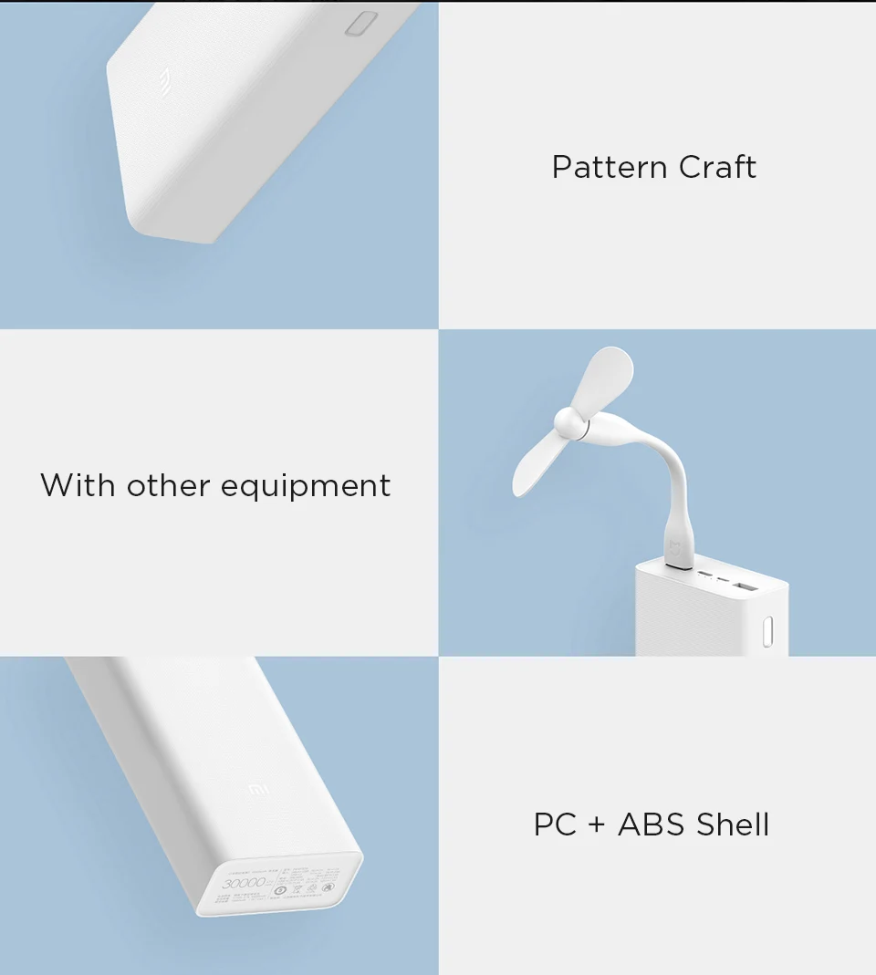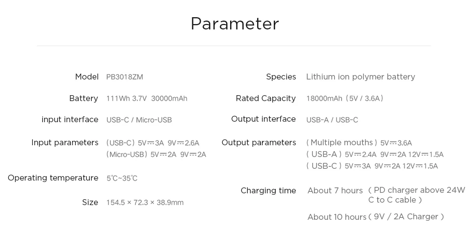 30000 мАч (3,7 V, 111W) Батарея емкость, фактическая Генерируемая на 18000 мА · ч (5V,3.6A)2 USB-A и 1 взаимный обмен данными между компьютером и периферийными устройствами с тройной USB output18W Max 2-полосная Быстрая зарядка