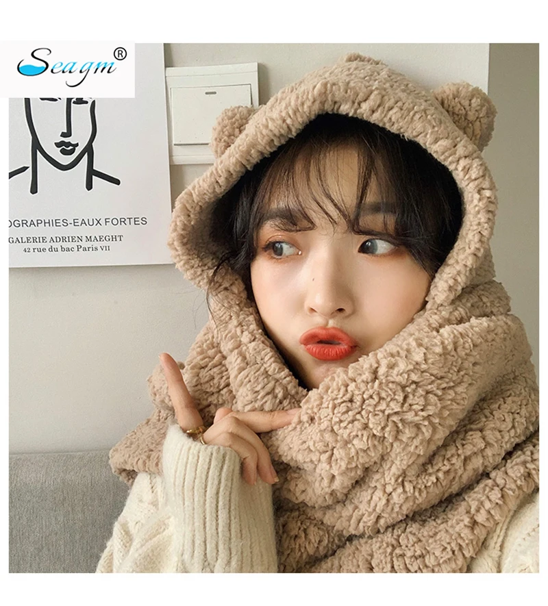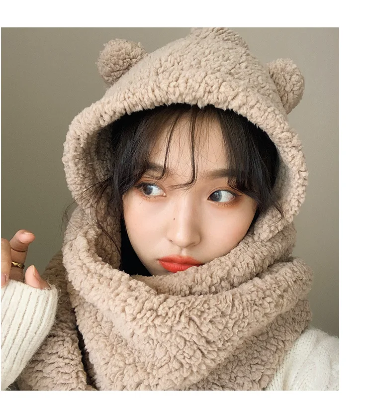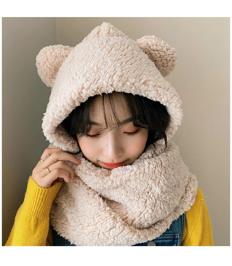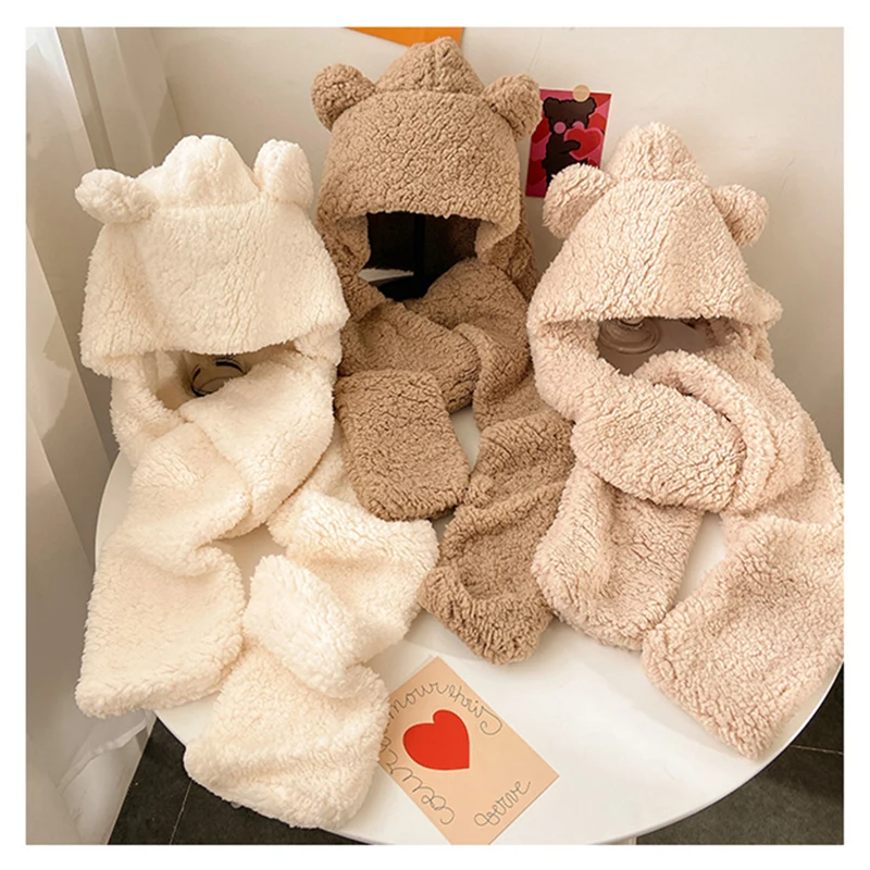 Шапка-бини женская с шарфом, однотонная теплая уличная шапка из искусственного меха, в форме медведя, зимняя