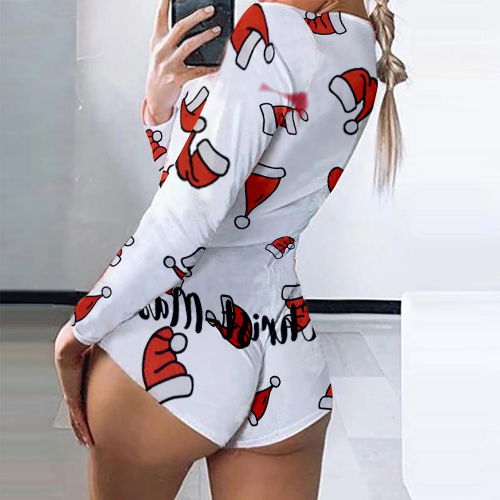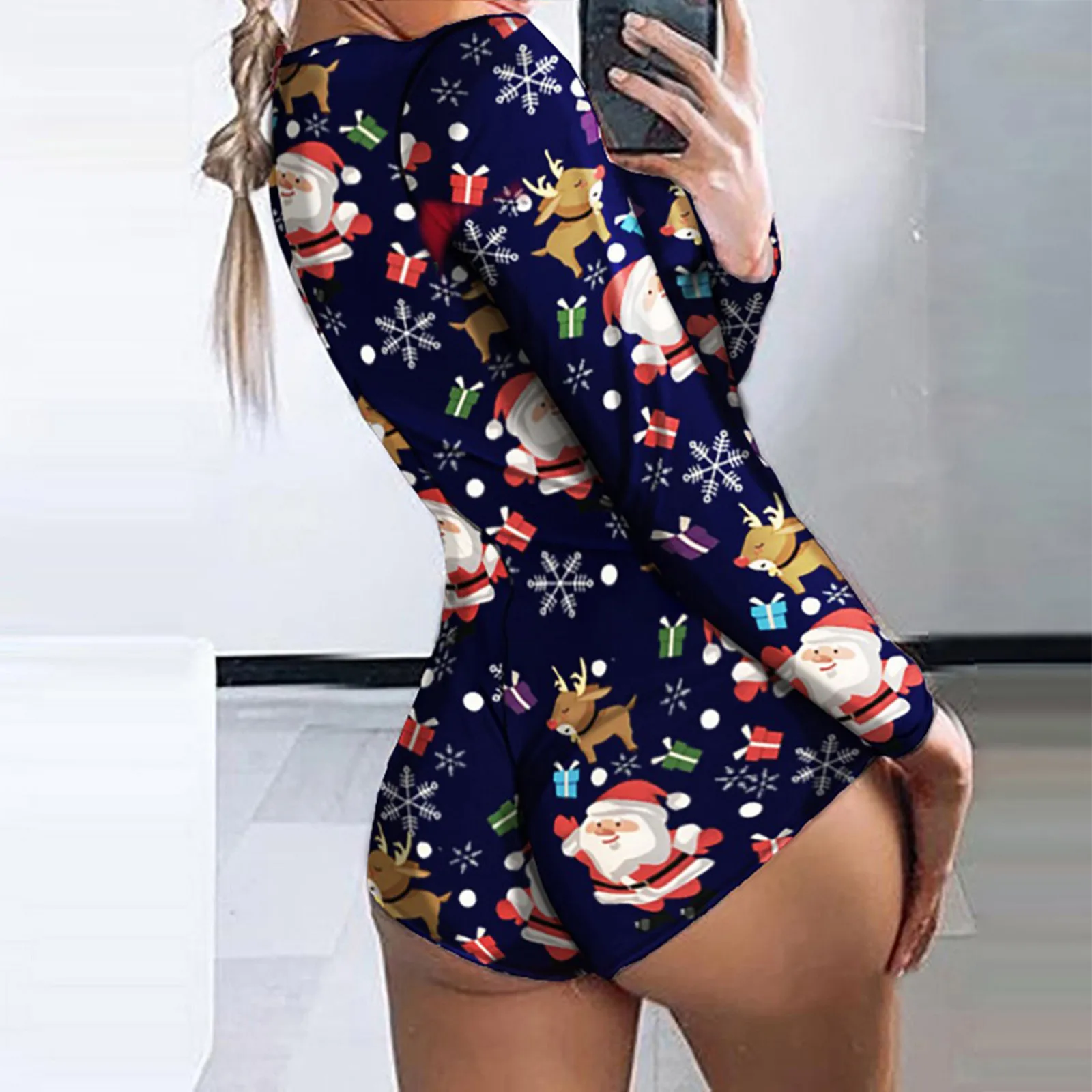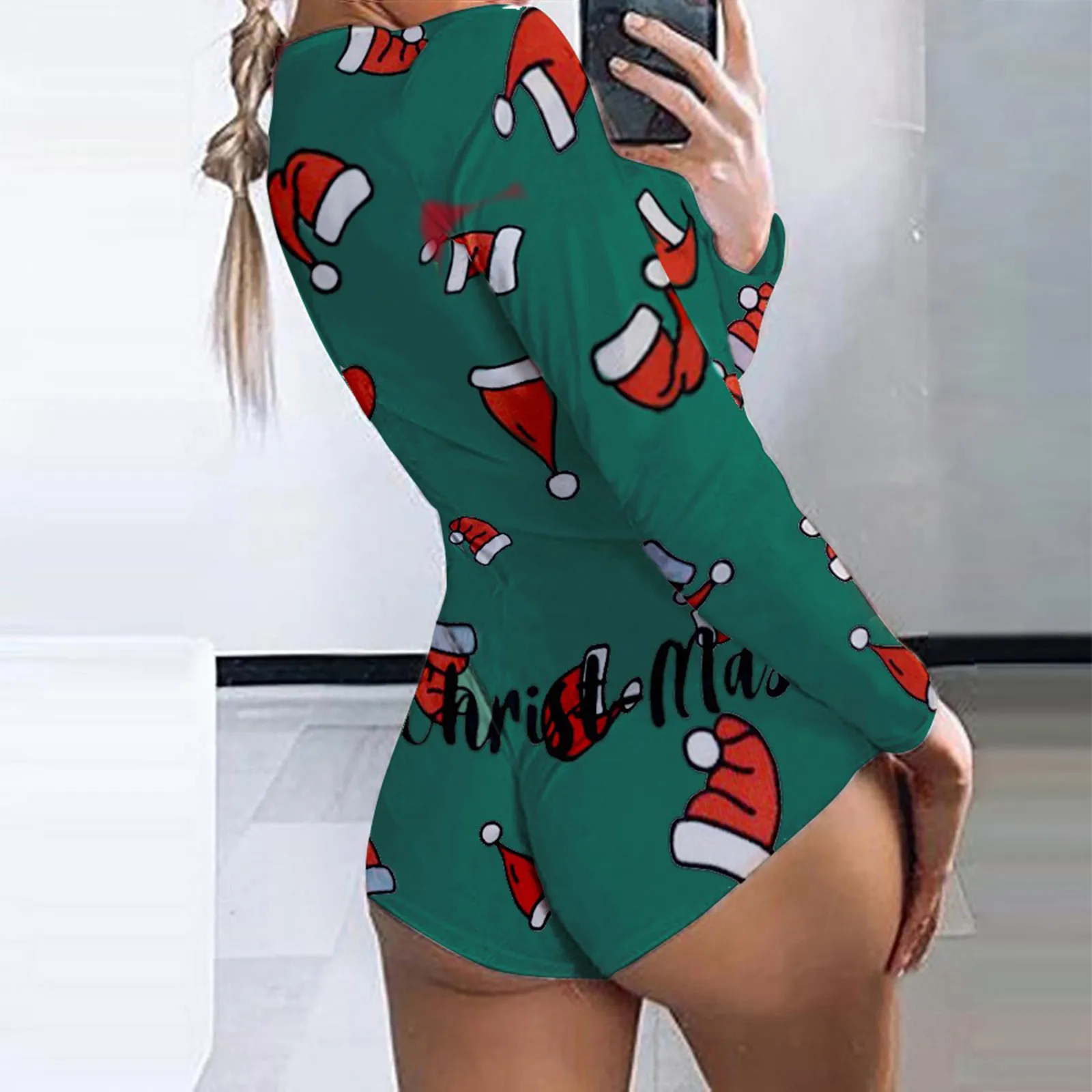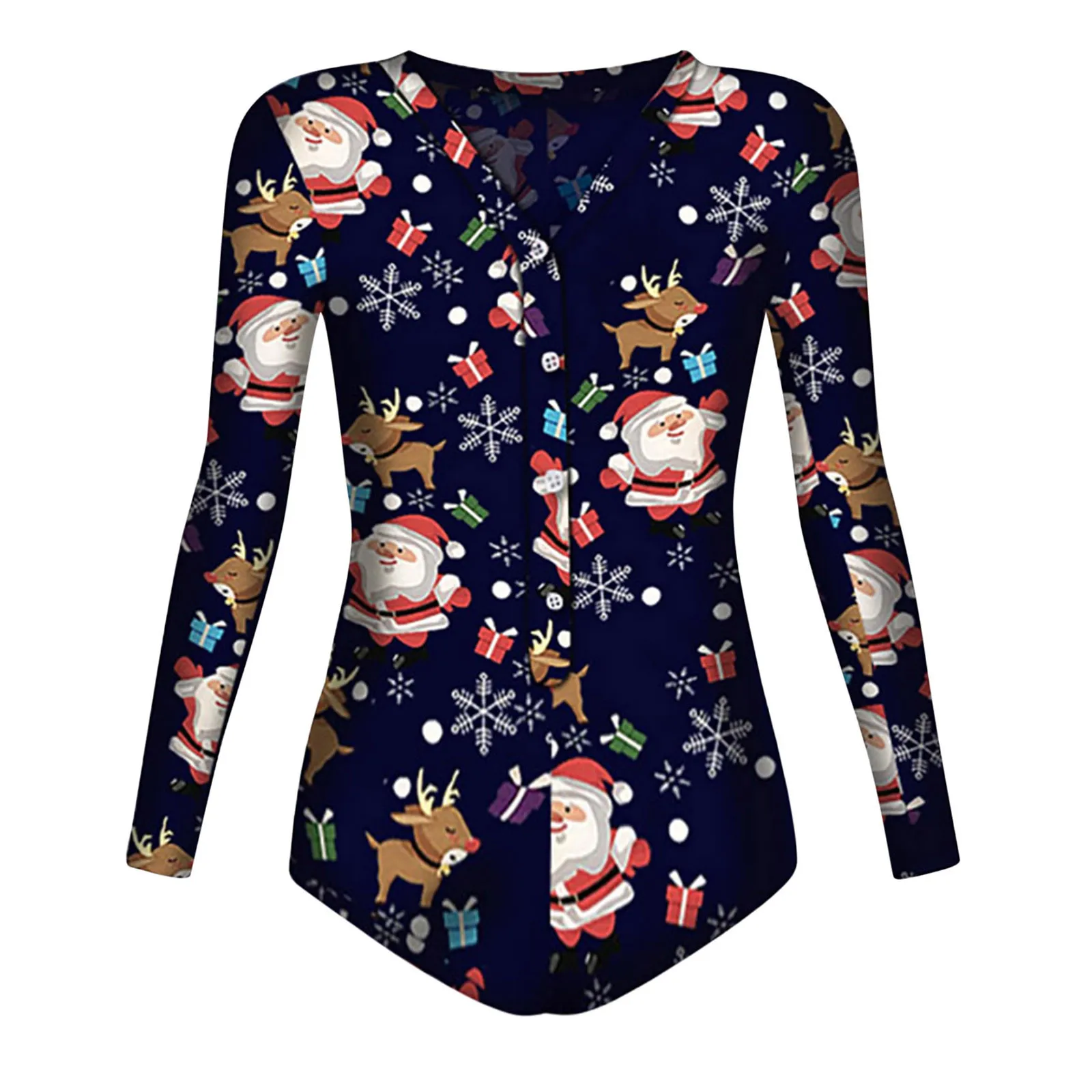 Сексуальное Женское боди с длинным рукавом, Рождественский Декор, Глубокий V-образный вырез, обтягивающее эластичное трико, топ на пуговицах, Короткий комбинезон, Пижамный комбинезон