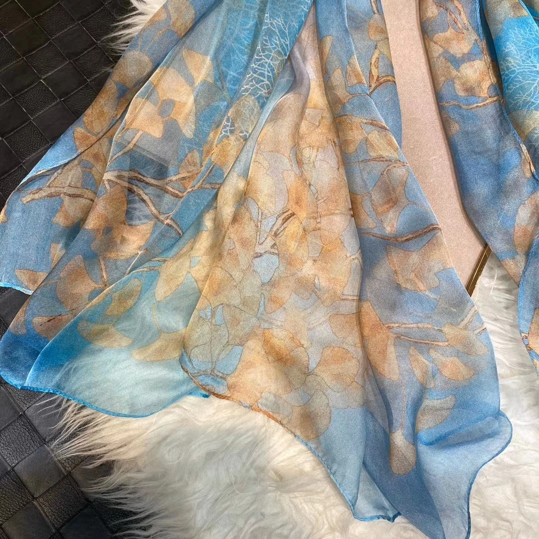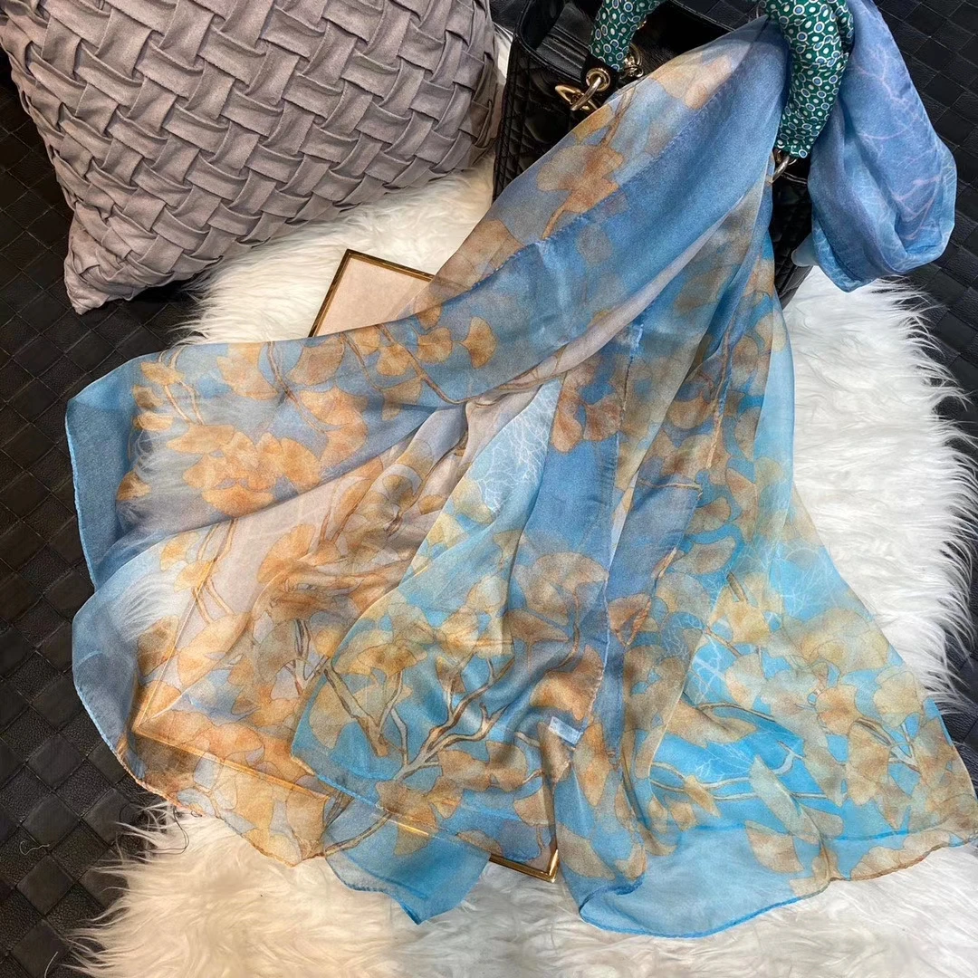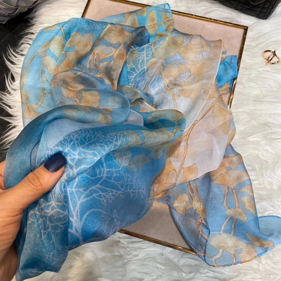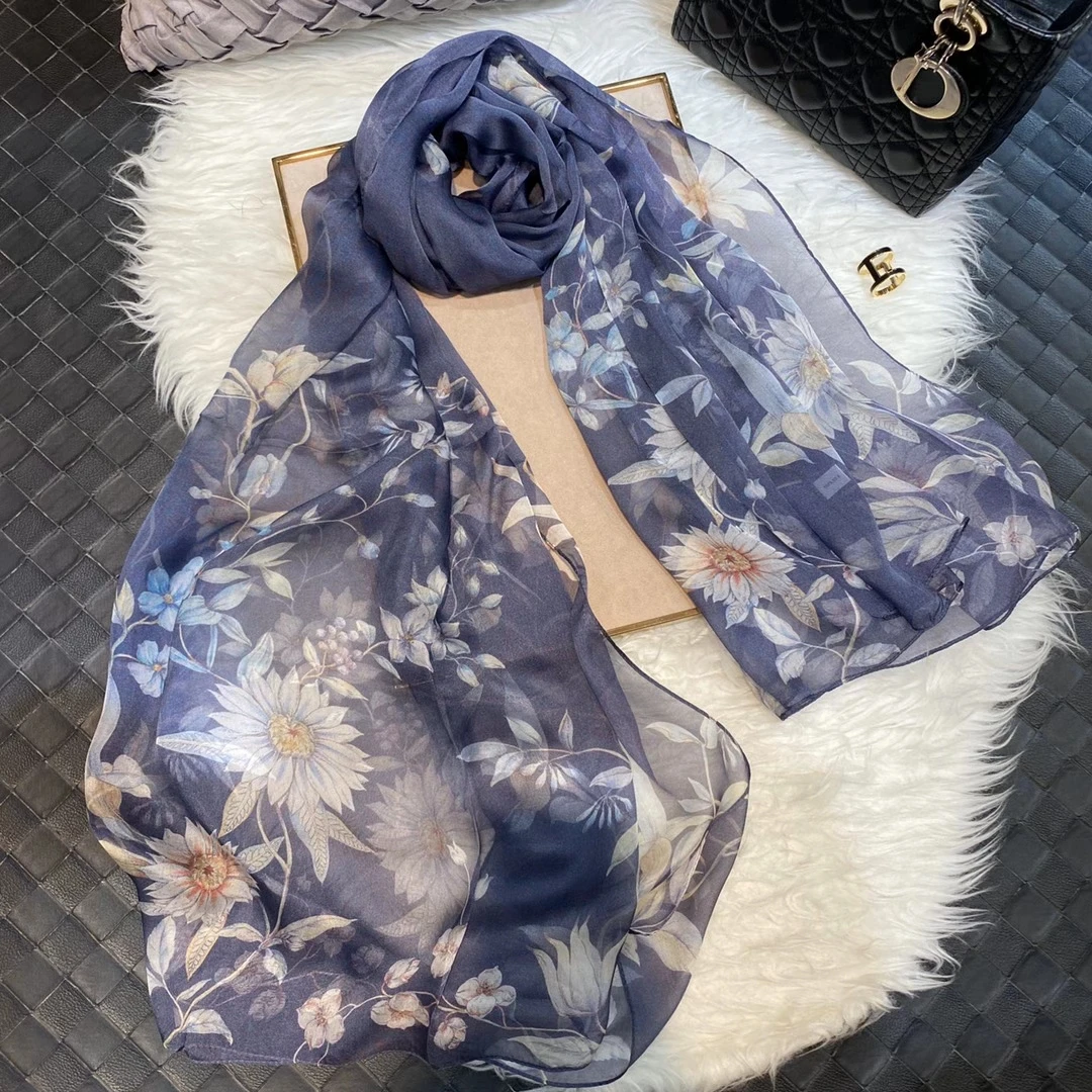 Модный Темно-Синий Шелковый шарф, шаль с принтом, роскошные женские длинные шарфы из 100% чистого шелка, элегантный шелковый шарф с цветочным принтом, 110 * см