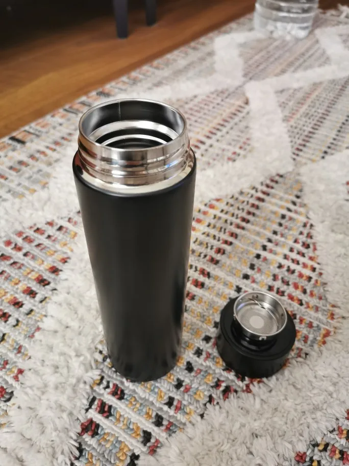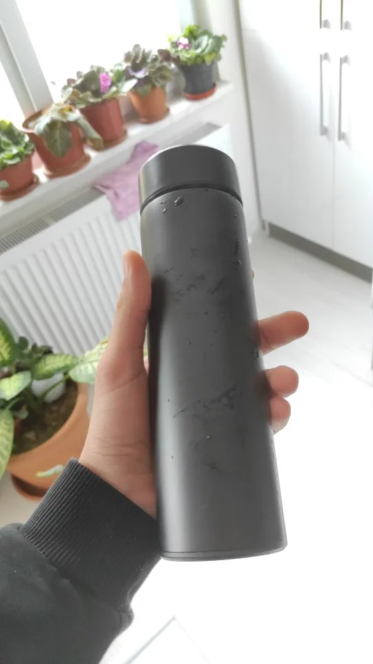 Бутылка прибыла в Польшу через две недели. Очень хорошо упаковано, ничего не сломалось. Бутылка показывает температуру внутри. Внутри также есть сито, поэтому вы можете положить чайные листья внутрь и пить, не беспокоясь, что вы их съедите. Хорошее преимущество. Бутылка выглядит действительно красиво и элегантно. Черный матовый цвет выглядит красиво и дорого. Настоятельно рекомендую этот товар и продавцу!