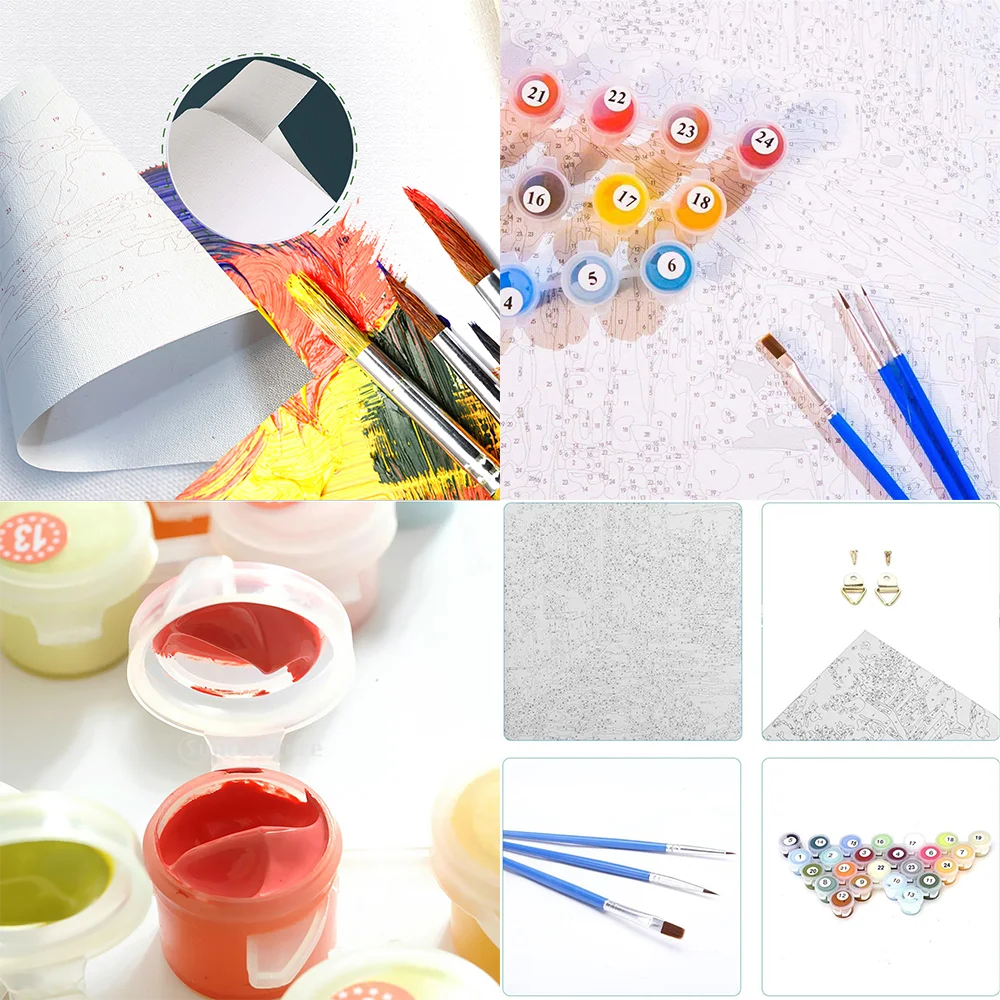 Упаковка включает:1 * Холст, 3 * кисть, 1 * Инструкция, 1 * краски, 2 * крючок без следов, 2 винта