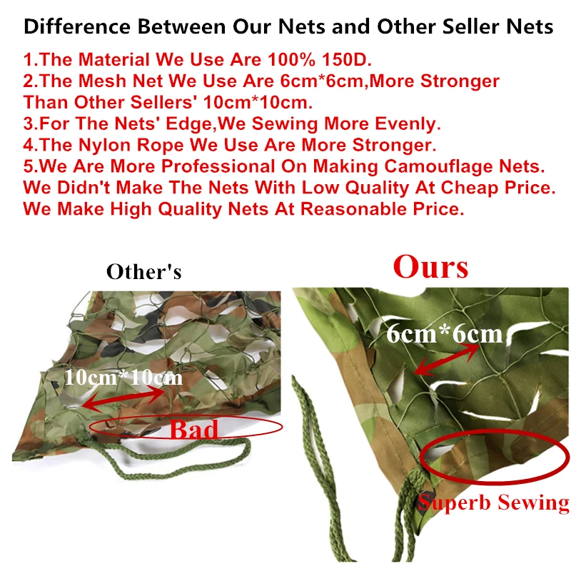 Название продукта: камуфляжная сеткаМатериал: 150D полиэстер ткань Оксфорд (качество лучше, чем у других продавцов 150D ткань Оксфорд)Цвет: Джунгли/Пустыня/цифровой/черный/белый/зеленый/синийПосылка включает в себя:1x двухслойная камуфляжная сеткаХарактеристика:-100% новый и высокое качество.-Военная камуфляжная сетка: есть слинг для каждого метра, так что вы можете легко повесить его. Мы пришили и усилили края камуфляжной сетки, чтобы сделать камуфляжную сетку более длинной и удобной в использовании.-Камуфляж очень эффективен, с реалистичными эффектами и универсальностью.Основные функции и назначение:-Камуфляжная военная подготовка, анти-Инфракрасный Радар для военных объектов.-Аэрофотосъемка земли ПВО для компаний по недвижимости.-Анти-спутниковая фотография незаконных зданий и растений.-Парковочные места и другие общественные места размывают окружающую среду.-Горы и зеленые покрытия покрывают мусор.-Для любителей наблюдения за птицами необходимо снимать далеко и общаться с замаскированными птицами.-Маскировка и использование военной игры снайпера.-Декорирование и декорирование (тематические парки, выставки, базы для фильмов, уличное развитие, моделирование поля CS, украшение отеля, промышленное украшение, украшение дома и т. д.)Примечание: Мы можем настроить другие размеры, которые вам нужны, если вы заинтересованы, пожалуйста, свяжитесь со мной.