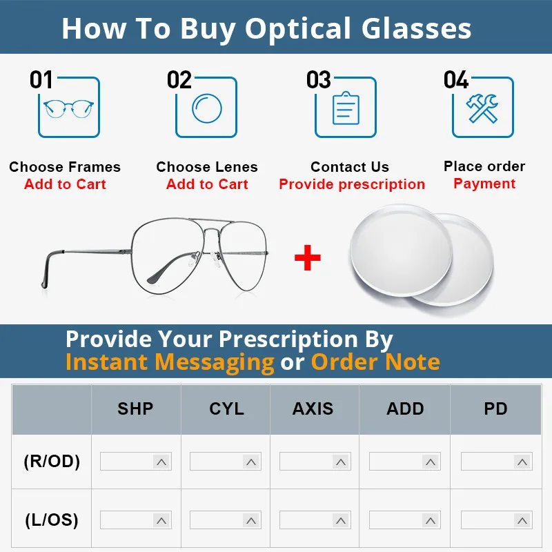 1. Рамка выбора 2. Объектив выбора 3. Предоставление данных 4. Подтвердите заказ Описание линз: Стандартная воздушная линза Наш Индекс 1,56 тонкий, легкий и ударопрочный Линзы CR-39 на 17% тоньше, чем стандартные отрасли. Плюс: ● Устойчивость к царапинам ● УФ-защита ● асферический ●тонкий Асферические линзы Сила внушения: Близорукость------ - SPH: -0,00 ~-3,00; CYL: -0,00 ~-2,00 Дальнозоркость --- SPH: + 0,25 ~ + 3,00; CYL:+ 0,00 ~ + 2,00 (добавить 15 $) Цилиндр ------ цилиндр: + 2,00 ~ + 4,00 или цилиндр:-2,00 ~-4,00 (добавить 15 $)