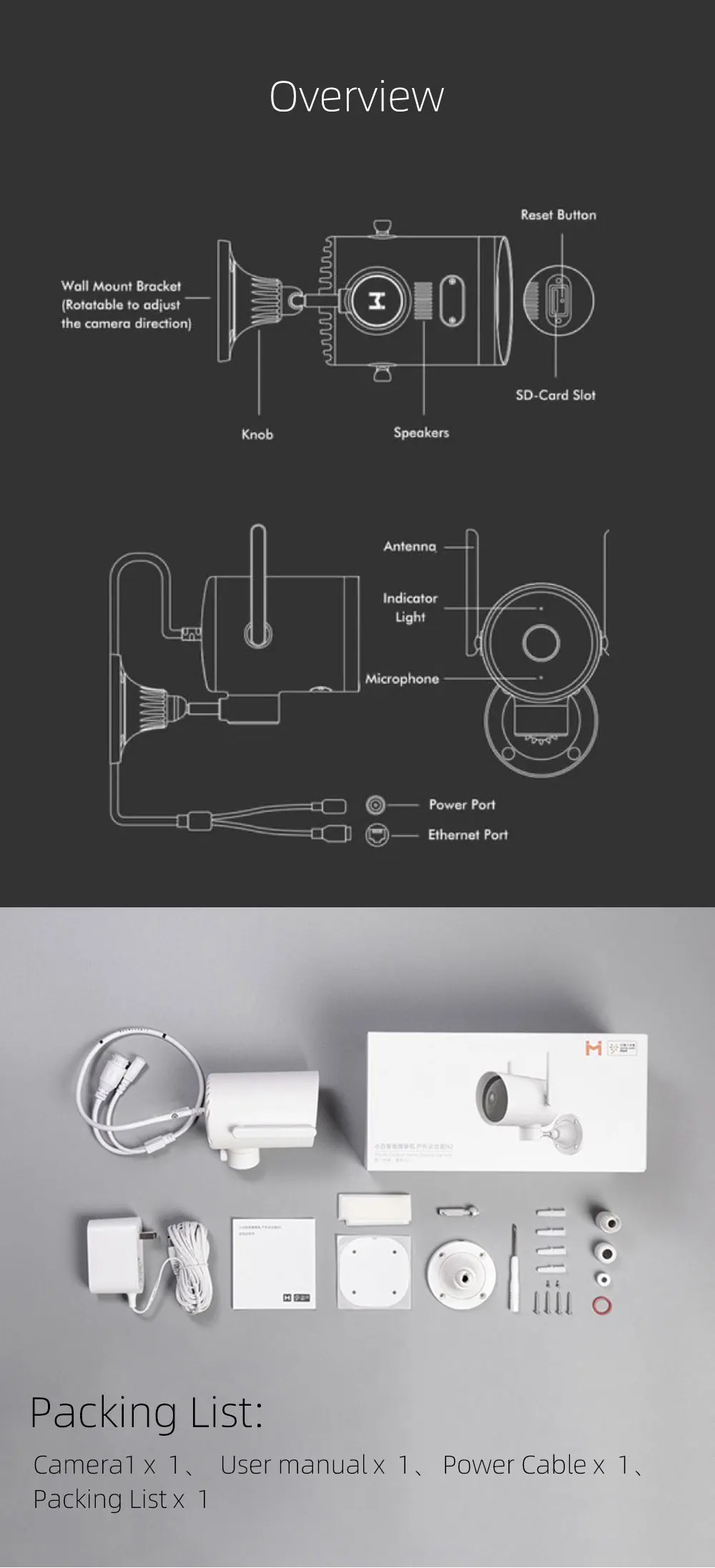 Характеристики:Бренд: IMILAB (от бренда Xiaomi Eco-chain)Модель: CMSXJ25AРазрешение: 1920*1080PДиафрагма: F1.6Вход: 12V/1AНапряжение: 220 В (пожалуйста, подтвердите, можете ли вы использовать напряжение или нет в вашей стране, спасибо)Рабочая температура: -20Deg.C - 60 Deg.CКодирование видео: H.265Беспроводной подключения: Wi-Fi IEEE 802,11 b/g/n 2,4 ГГцБеспроводной подключения: 1*10/100M сетевой Порты и разъёмыПоддержка ОС: Android 4,4 или iOS 9,0 и вышеВес посылка: прибл. 900 г/31,75 унцийРазмер посылка: прибл. 16*8*8 см/6,30*3,15*3,15 дюймовУпаковочный лист:1.IMILAB EC32. Руководство пользователя3. Мощность4. Монтажный пакет