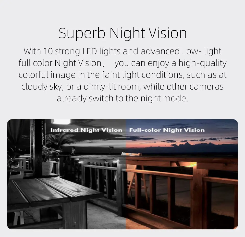 С 10 сильным светодиодный светильник s и продвинутый низкий светильник, полный цвет ночного видения, вы можете наслаждаться высокое качество красочные изображения в условиях слабой светильник, таких как в пасмурном небе, или тускло освещенную комнату, в то время как другие камеры уже переключаются в ночной режим.