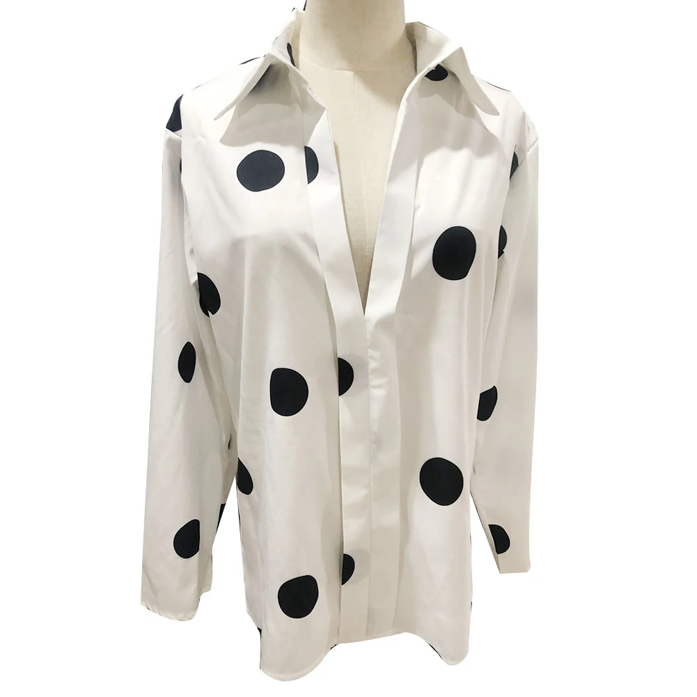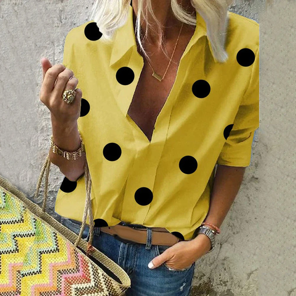 Женская блузка с отложным воротником, рубашка с длинным рукавом и принтом в горошек, Повседневная Блузка, лидер продаж, базовые блузки на пуговицах, топы с принтом