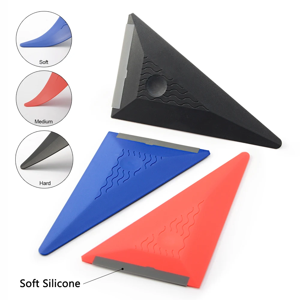 1. Три угла с тремя разными формами позволяют идеально обернуть пленку на разные поверхности. Это должен быть необходимый набор инструментов для обертывания окон автомобиля, дверной ручки и других неровных поверхностей.2. Треугольная конструкция позволяет удобно брать скребок. Благодаря противоскользящему захвату вы можете надежно удерживать его для эффективной работы.3. Пластиковый скребок из одностороннего силиконового материала может лучше обернуть виниловую пленку, легко удалить пузырьки воздуха или прыщи, но не поцарапать пленку.4. 3 в 1 комплект с ракелем. Три цвета для трех твердостей. Вы можете выбрать один для использования по вашим требованиям.СинийРакель самый мягкий из трёх. Хорошо работает в угловой и угловой обмотке.КрасныйСкребок изготовлен из среднего мягкого материала. Хорошо удаляет пузырьки воздуха.ЧерныйСкребок самый сложный из трёх. Полезный инструмент для удаления старых наклеек, наклеек.