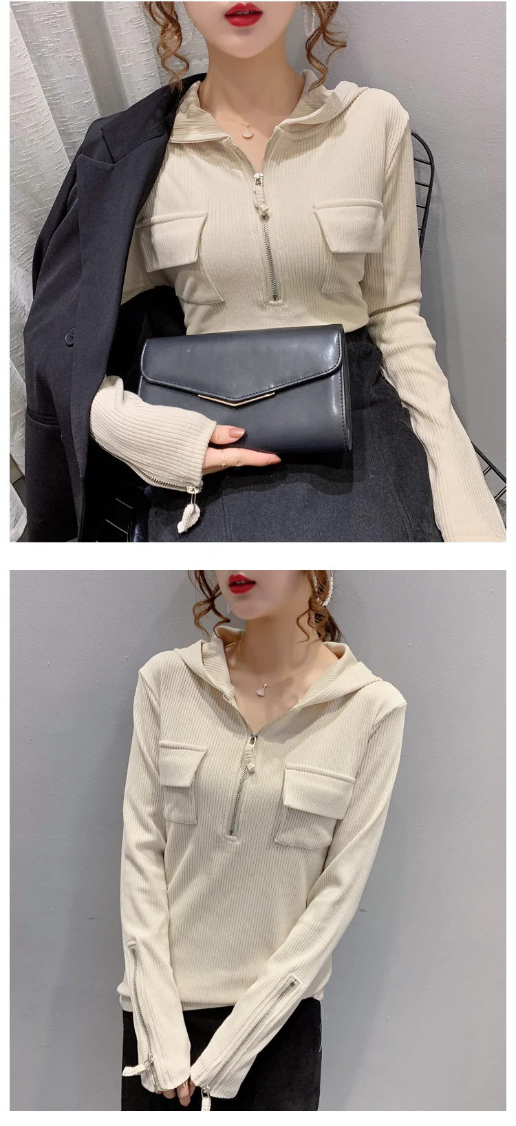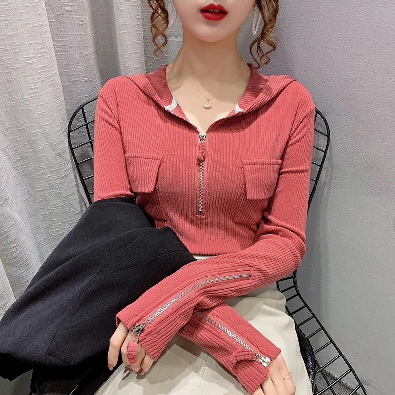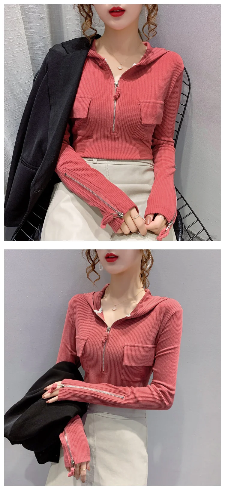 Свитер женский на молнии с капюшоном #6537, Повседневный, приталенный, весна-осень