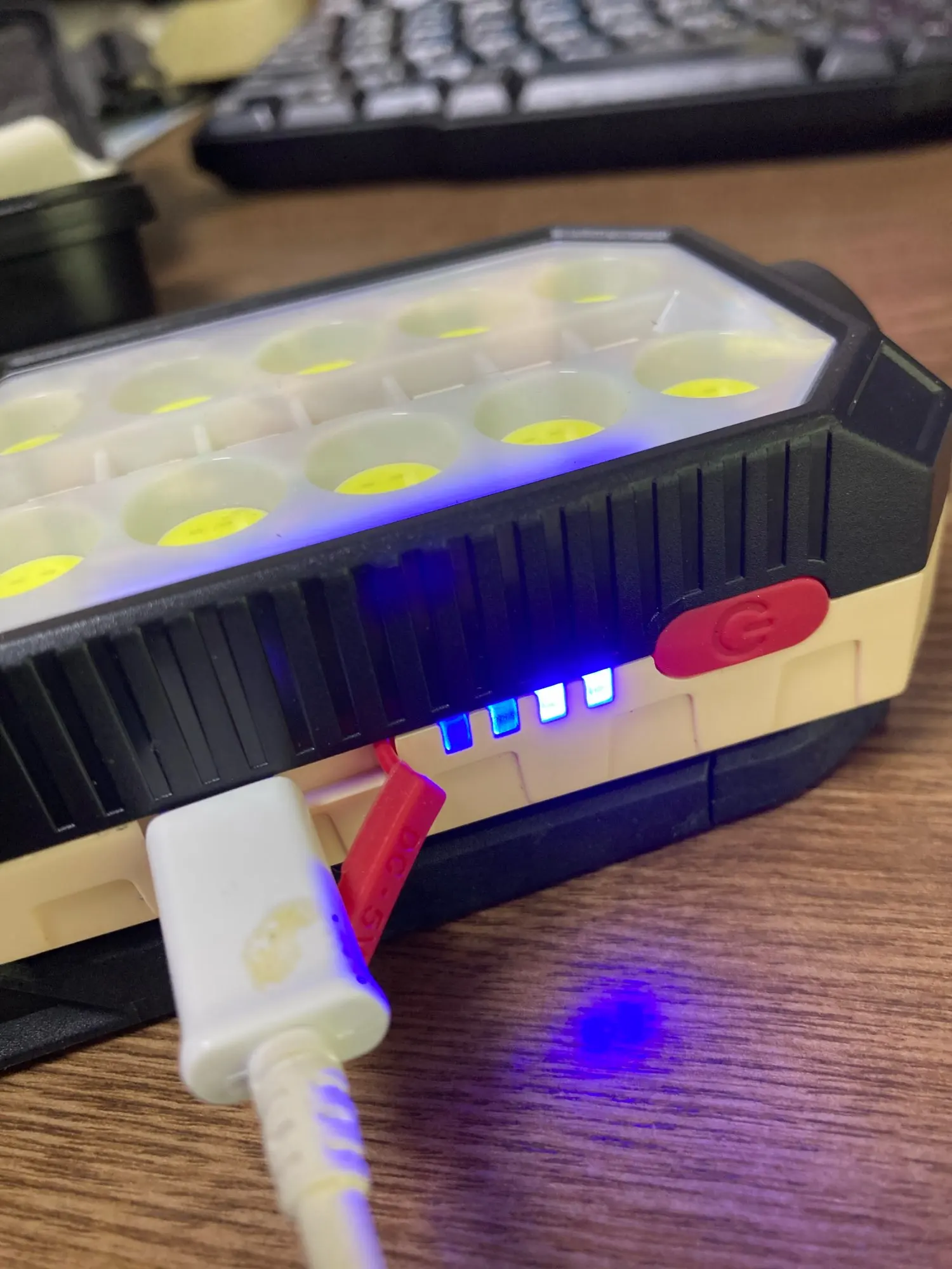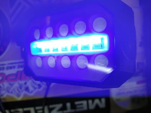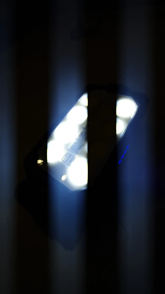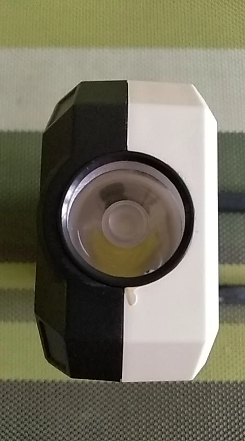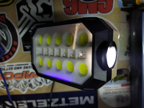 Фонарь светит хорошо, ярко. Мерцают все режимы фонаря, нет идеально ровного свечения светодиодов ( на фото не видно). Дальний свет( с торца) 1 режим, все светодиоды на передней понели, 2 режима ( яркий и менее яркий). Полицейская мигалка, мигает.