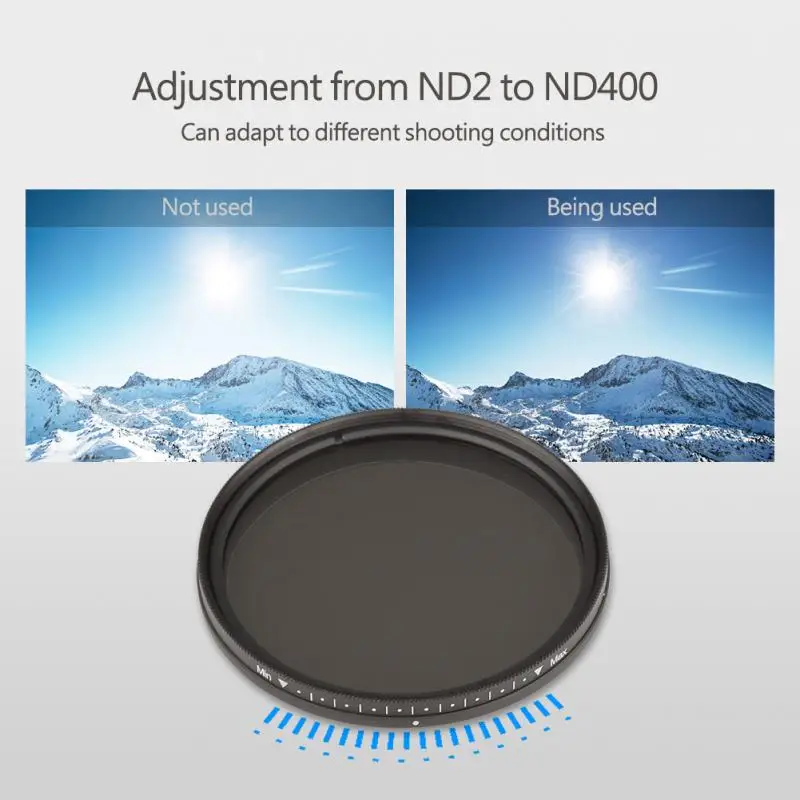 Толщина всего 1,40 мм, широкоугольный объектив совместим с ультра тонкой рамкой.С нейтральными серыми фильтрами переменной плотности пользователи могут выбрать интенсивность от ND2 (1 f-stop) до ND400 (9 + f-stops), вращая переднее кольцо.Стекло, установленное по технологии пресса высокого давления. Все материалы, используемые в этом фильтре, соответствуют требованиям стандартов Европейского союза по защите окружающей среды-ROHS (ограничения на опасные вещества). Фильтры нейтральной плотности используются для уменьшения количества светильник, который достигает датчика камеры. Они позволяют уменьшить скорость затвора, чтобы достичь размытия движения (водопады, океан, облака...) и/или уменьшить глубину поля в очень ярких условиях. Поскольку они являются «нейтральными», фильтры ND не влияют на цветопередачу. С нейтральными серыми фильтрами переменной плотности Zomei пользователи могут выбрать интенсивность от ND2 (1 f-stop) до ND400 (9 + f-stops), вращая переднее кольцо. Примечание:При использовании фильтра ND с максимальной плотностью на изображении будет видно размытие «X».Это нормальное оптическое явление.