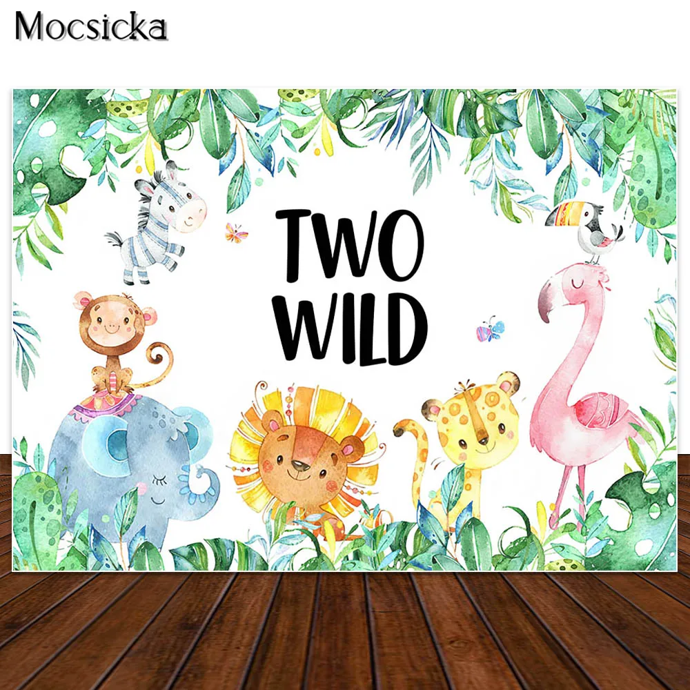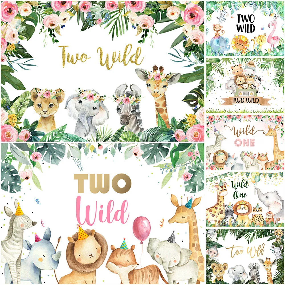 Фон для фотосъемки с изображением девушки двоих диких джунглей сафари животных на 2 день рождения торта десерта декора стола баннера
