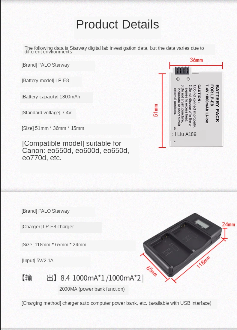 Зарядное устройство PALO LPE8 с ЖК-дисплеем для Canon EOS 550D 600D...