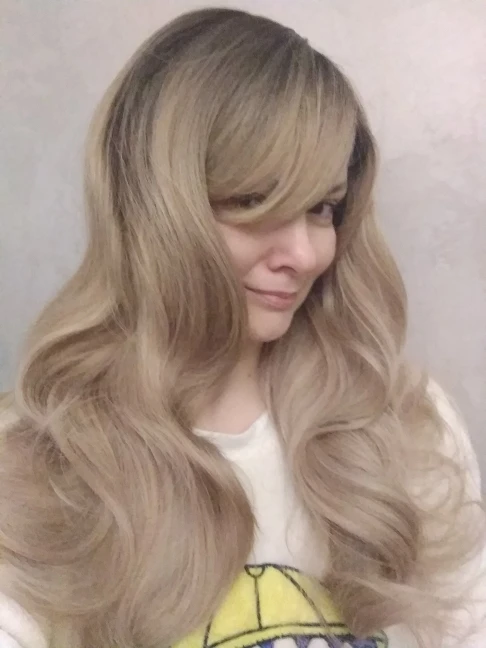 Very beautiful high quality wig. Has natural luster, not cheap luster. The waves are looser than in the photo, but this looks better to me. The bangs are very long, so you can cut them at will.