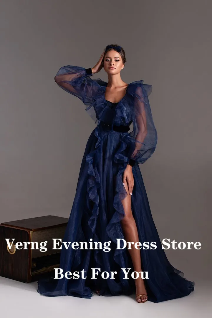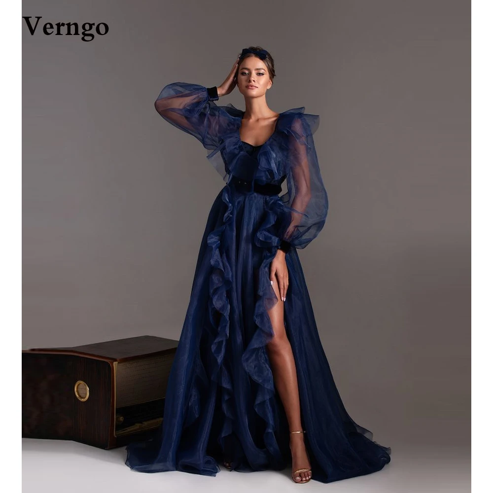 Verngo элегантное темно-синее Тюлевое вечернее платье с длинными пышными рукавами, V-образным вырезом и оборками, с высоким разрезом, халаты с поясом для выпускного вечера 2021