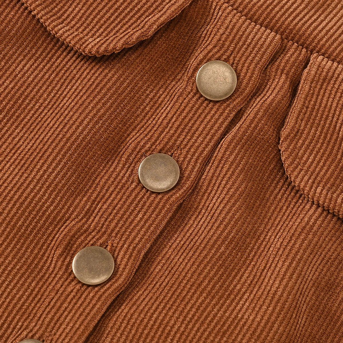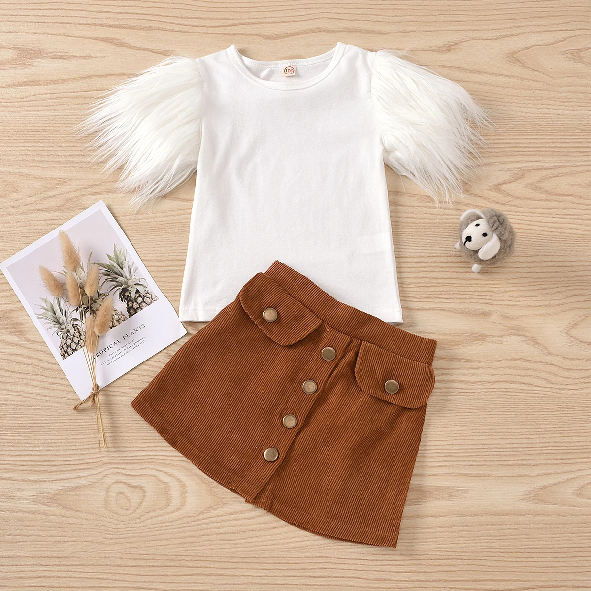 Комплект одежды для девочек 2-8 лет, топ с перьевым рукавом и круглым вырезом + коричневая юбка на пуговицах
