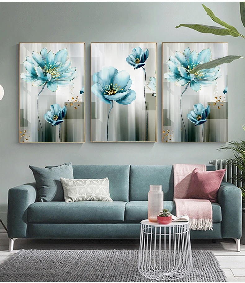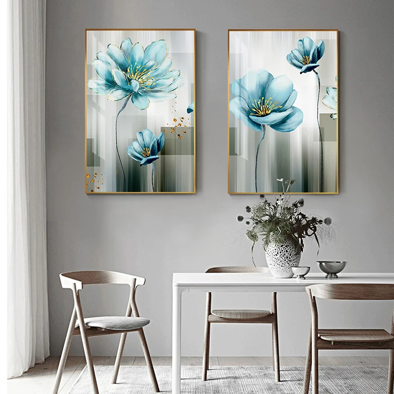 Скандинавская Картина на холсте абстрактный Золотой синий цветок, плакат, печать, настенные художественные картины для гостиной, интерьера, украшения для дома