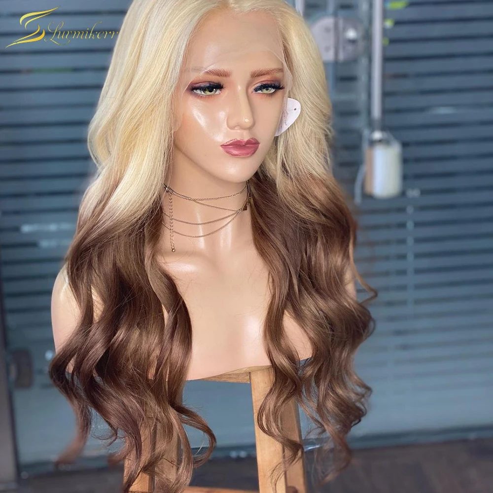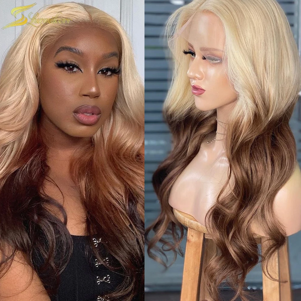 Омбре цвет КОРИЧНЕВЫЙ блонд свободная глубокая волна фронтальный парик 613 тело волна кружева передний парик HD кружева 30 дюймов человеческие волосы парик Полный preprucked