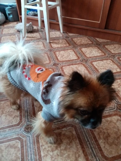 Свитер отличный,но я ошиблась с размером,надо было брать на размер больше.На мальчика-шпица (миниатюрного) заказала размер L, оказался впритык.А в целом цвет яркий,как на картинке