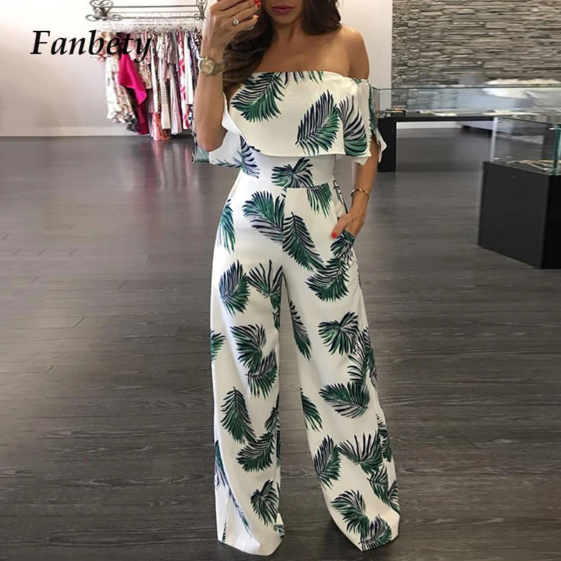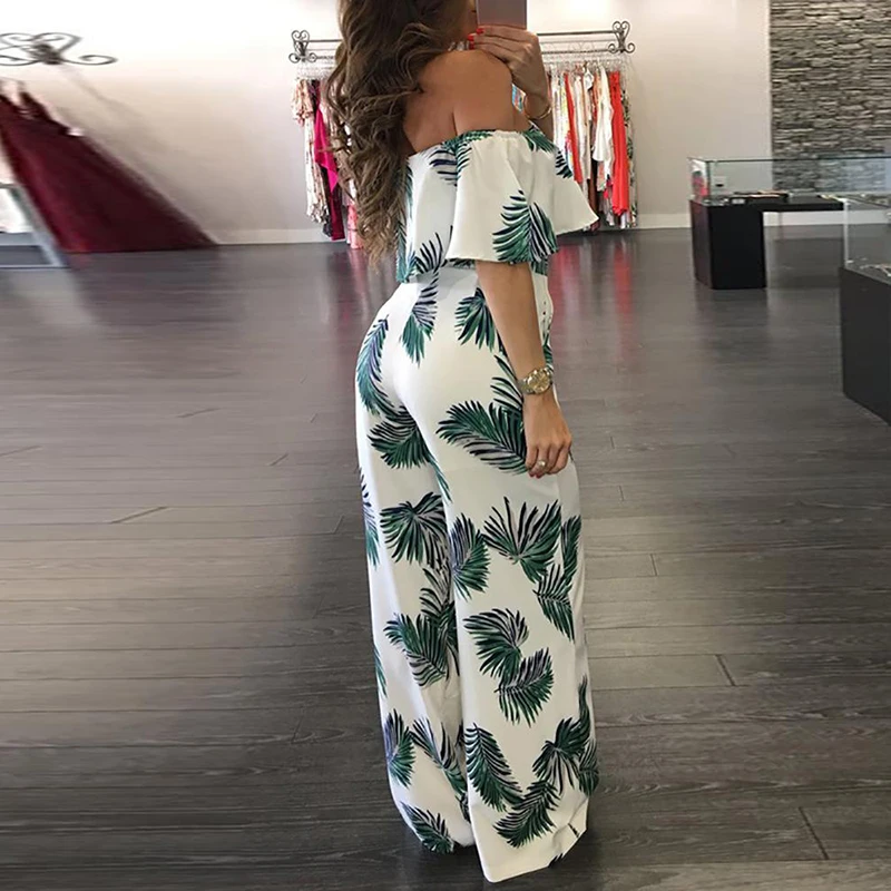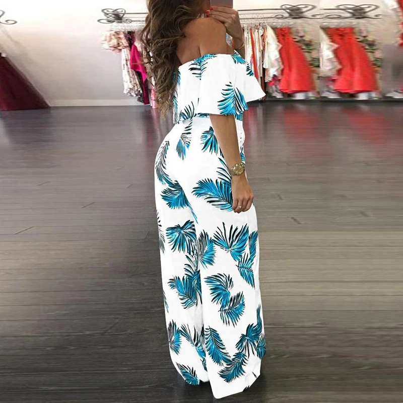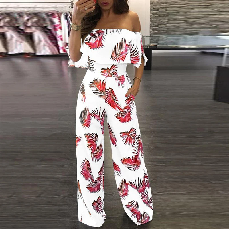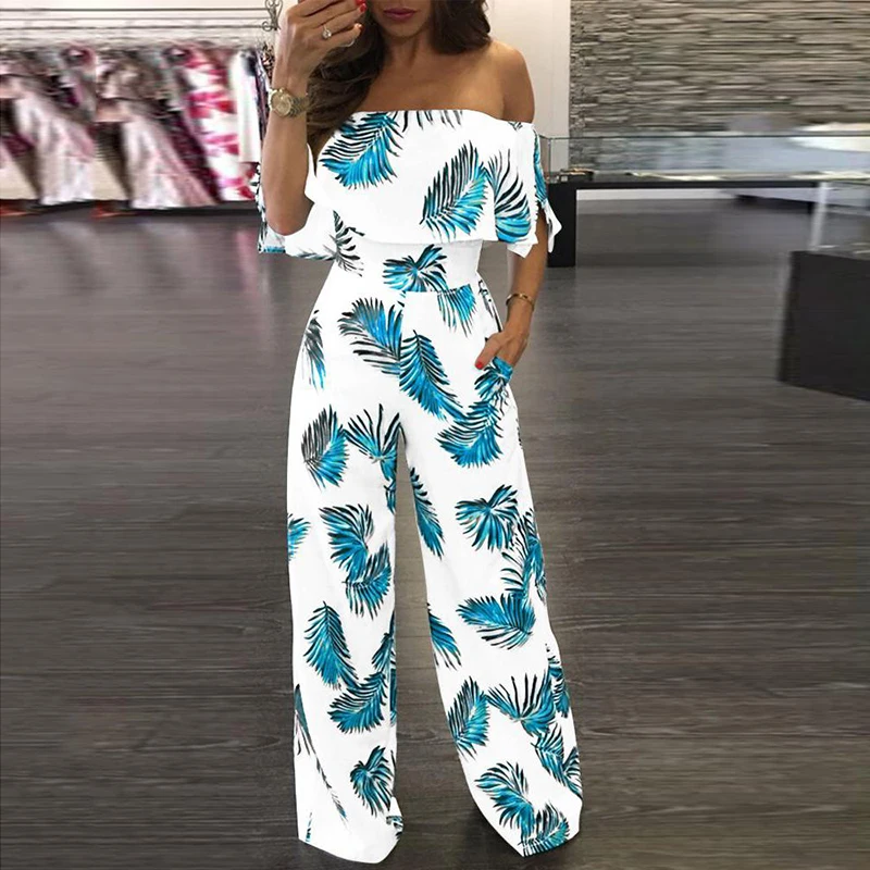 2021 Весна принт с открытыми плечами комбинезон женский элегантный оборками Свободные штанины ползунки; Модные офисные женские туфли на каждый день комбинезоны с карманами