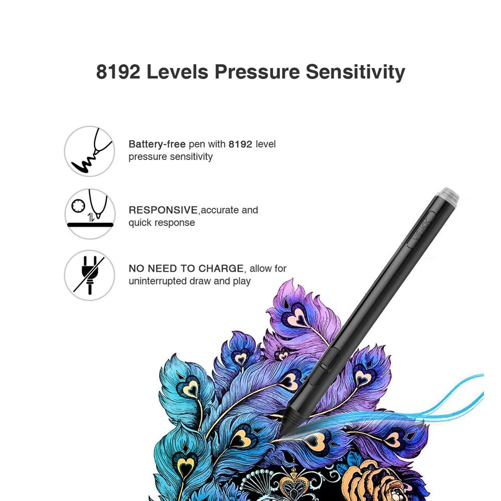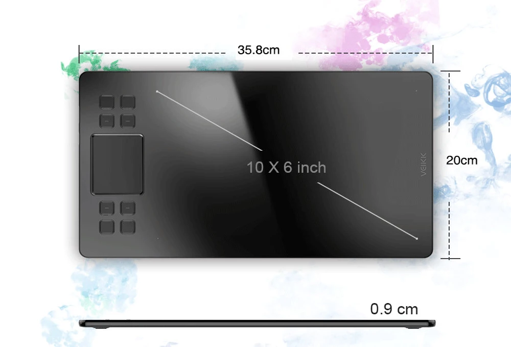 Размер изделия: 358 мм (Д) x 200 мм (Ш) x 9 мм (В) Активная область: 10x6 дюймов Ручка: пассивная ручка без аккумулятора Давление ручки: 8192 уровней Скорость передачи данных: 250pps (точки/секунды) Высота чтения: 10 мм