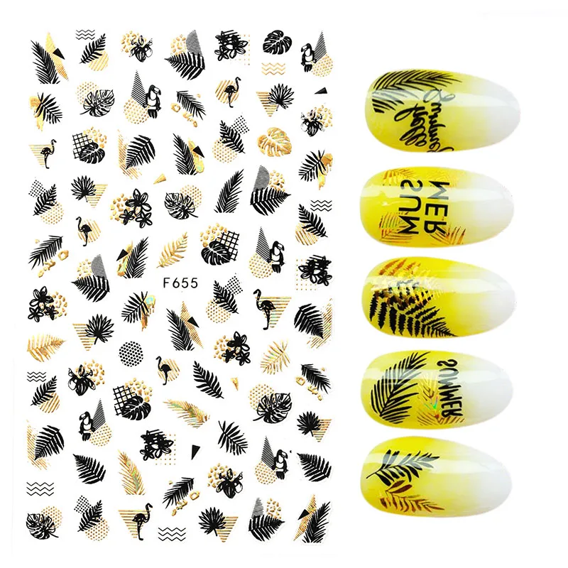Черные лазерные золотые осенние листья, 1 шт., 3D наклейки для ногтей, узор в виде листьев кокосового дерева, клейкие переводные наклейки, блестящие украшения для ногтей своими руками