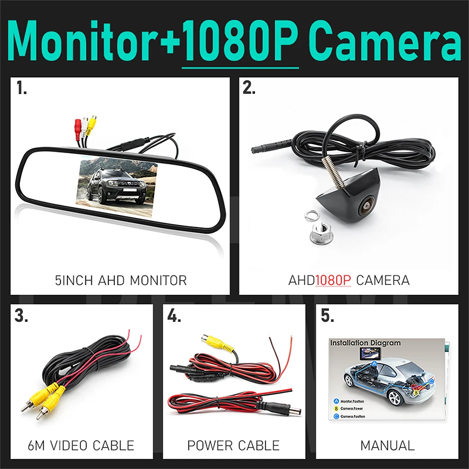 1 x аналоговая камера высокого разрешения 5 дюймов автомобиля зеркало монитор1 x камера заднего вида AHD1 х 6 м видео кабель2x1,5 м Мощность кабель2 x установочный винт