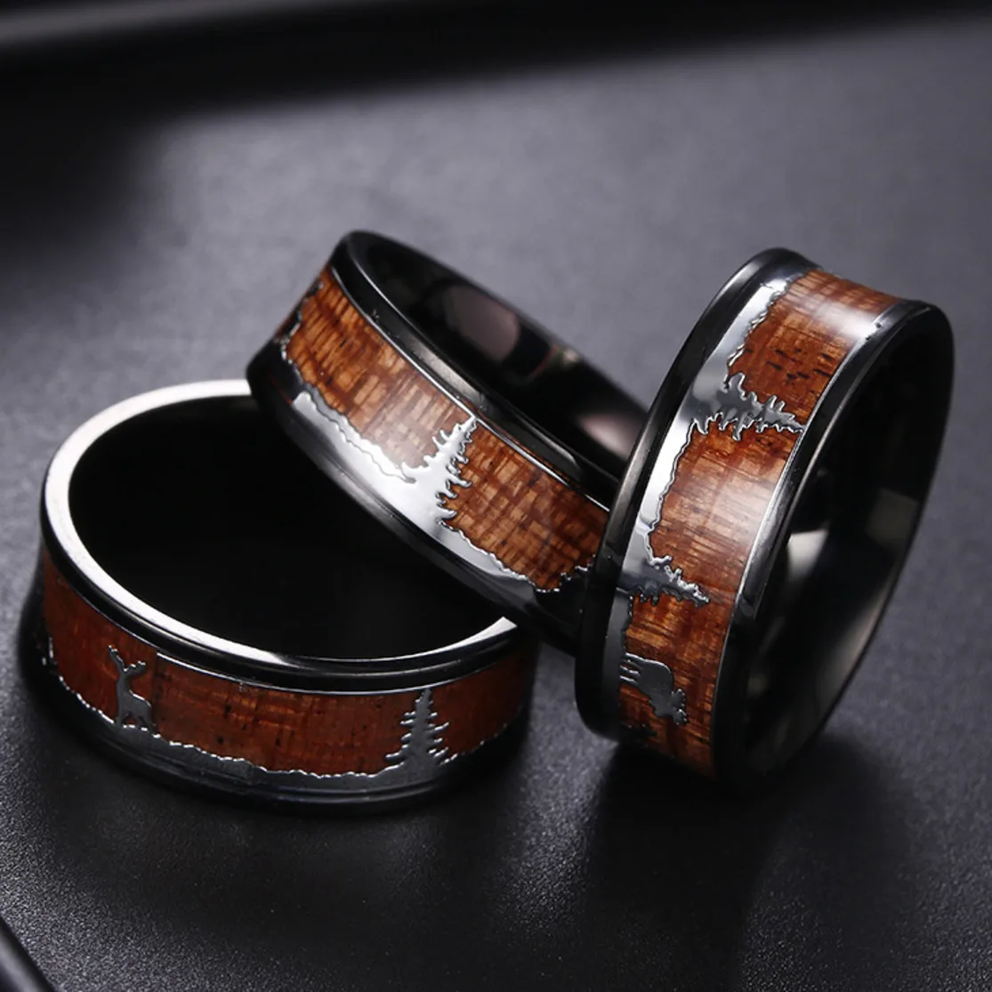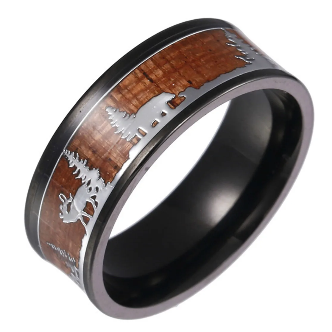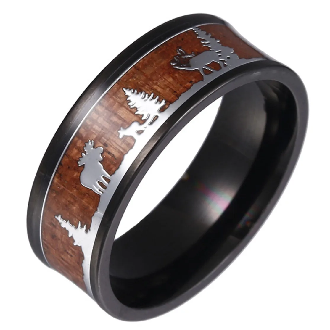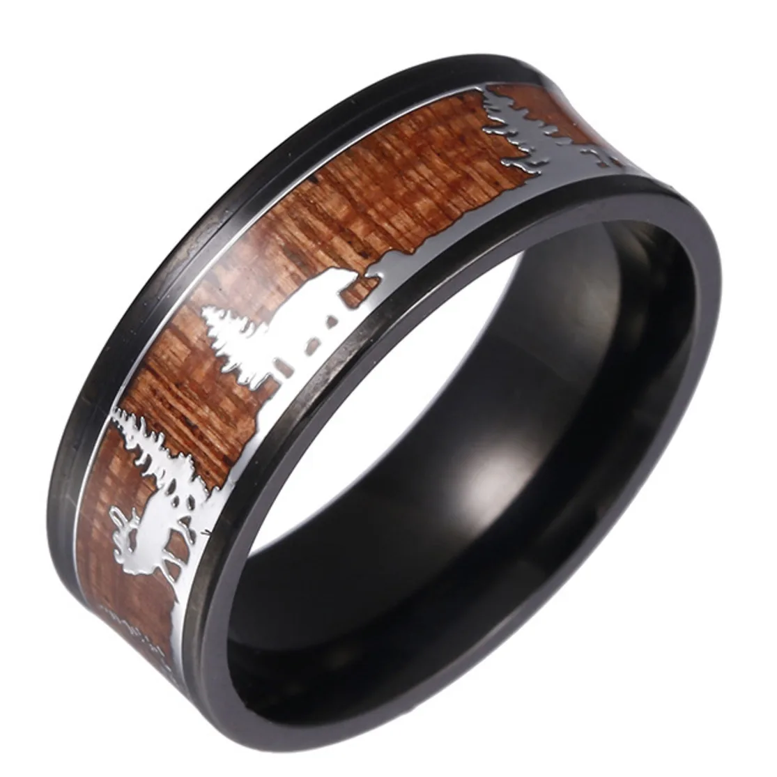 Унисекс черное кольцо из нержавеющей стали для охоты, обручальное кольцо, дерево, инкрустация оленем, силуэт, рождественский подарок, кольца для женщин
