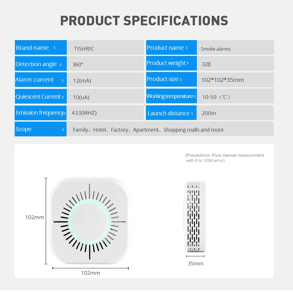 В основном используется для обнаружения пожара, когда происходит пожар, Беспроводной детектор дыма немедленно посылает сигнал тревоги и посылает 433 сигнала на хост огня, расстояние беспроводной передачи составляет 200 метров от открытого;