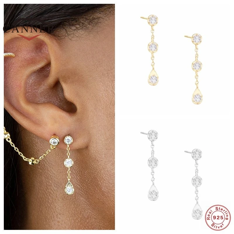 Автоклав 925 стерлингового серебра, сереьряные серьги гвоздики для женщин, женские модные туфли в лаконичном стиле 3 цирконами Пирсинг Серьга сережки с цепочкой, ювелирное изделие, подарок Pendientes