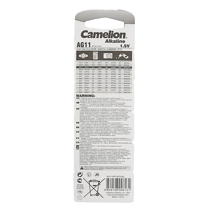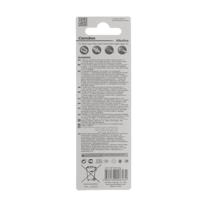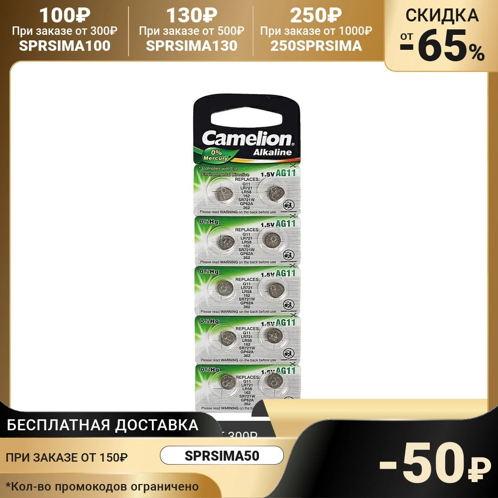 Батарейка алкалиновая Camelion Mercury Free, AG11, 362, LR721-10BL, 1.5В, блистер, 10 шт 3781565