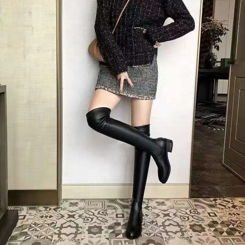 Женские ботфорты из искусственной кожи, тонкие эластичные сапоги выше колена на низком среднем каблуке, на плоской подошве, 2020