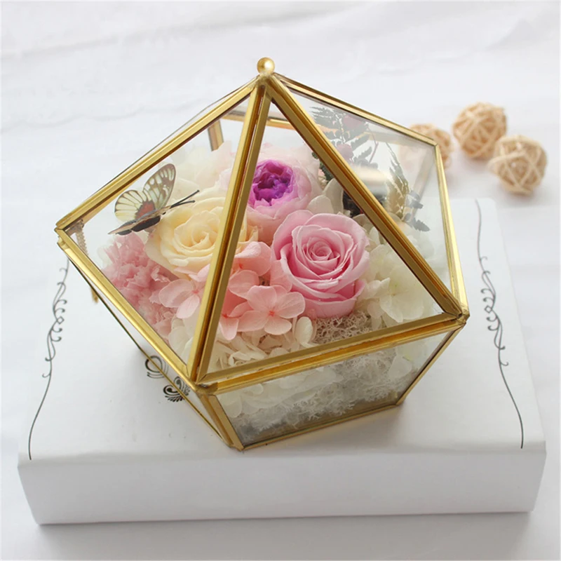 Шестигранная коробка для колец с геометрическим рисунком, прозрачная стеклянная шкатулка для украшений, Свадебный чехол для украшений, неувядающий цветок с крышкой, Домашний Настольный Органайзер