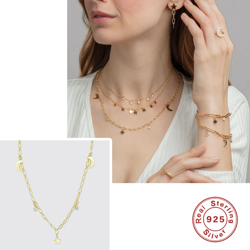 Автоклав реальные 925 стерлингового серебра в европейском и американском стиле; С рисунком Луна, Звезды Циркон ожерелье для женщин колье, хорошее ювелирное изделие, ожерелье