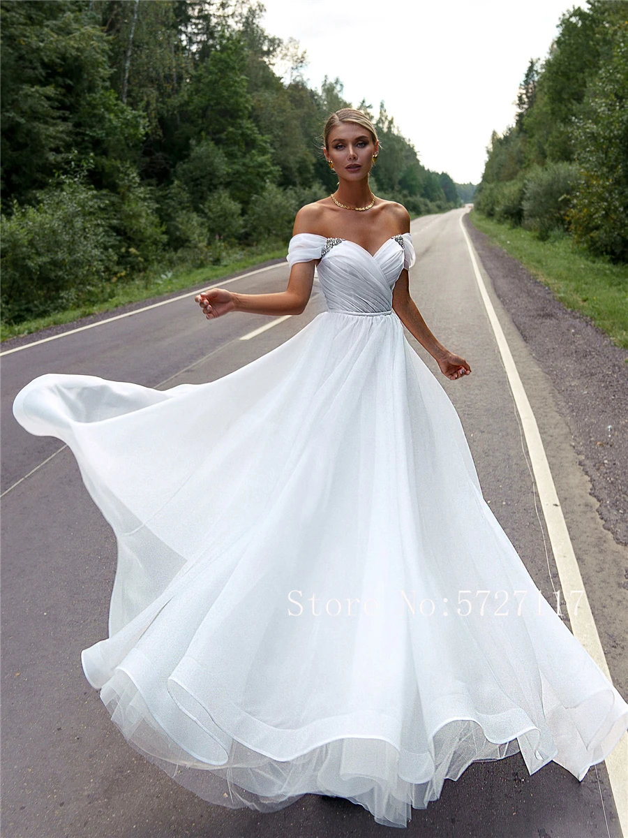 Свадебное платье с открытыми плечами и стразы, Элегантное свадебное платье с завышенной талией и шлейфом
