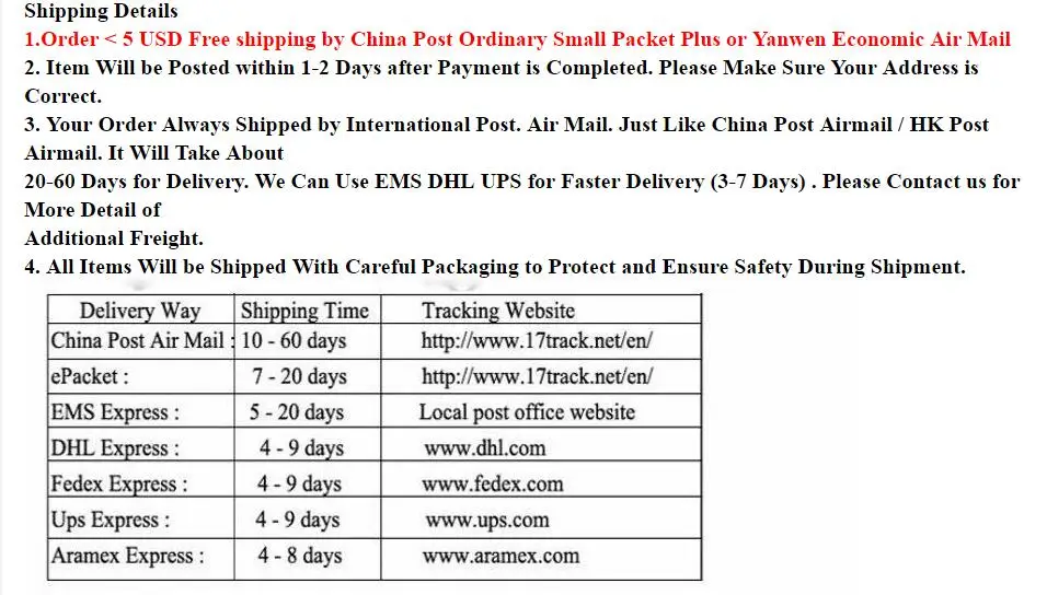 Политика Возврата 1. Мы несем ответственность за любые повреждения или потери, понесенные в процессе доставки. Если вы не получили ваш товар вовремя Пожалуйста, немедленно свяжитесь с нами для получения дополнительной помощи. 2. Покупатели должны делать фотографии поврежденного товара. Мы предоставим вам быстрый обмен или возврат средств. 3. Пожалуйста, обратите внимание, что размер и цвет представлены в зависимости от производственной разницы и могут быть неточными. Также обратите внимание, что Настройки монитора могут отличаться от компьютера к компьютеру и искажать фактические цвета Отзывы и контакты 1. Мы оставим вам положительные отзывы, и мы ценим ваши положительные отзывы с пятью звездами, как только вы получите товар. 2. Если у вас есть какие-либо сомнения или недовольство, пожалуйста, не оставляйте нейтральный или отрицательный отзывы. Вы можете сначала связаться с нами, и мы Мы сделаем все возможное, чтобы решить эту проблему. На все ваши сообщения ответят в течение 24 часов.