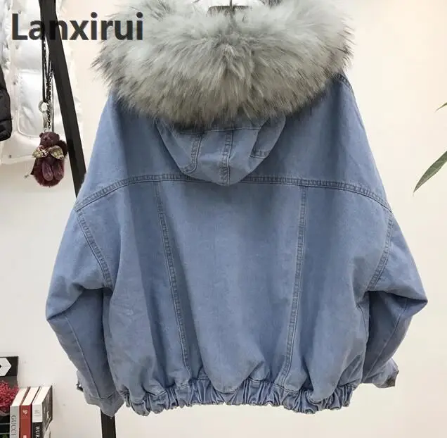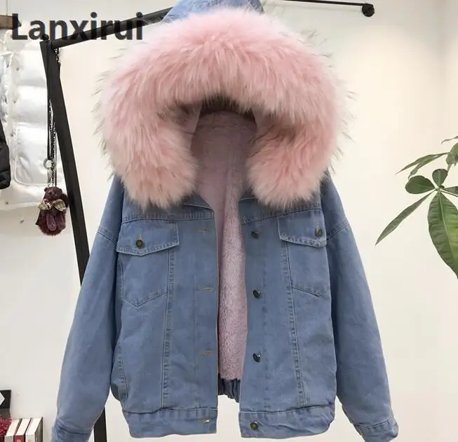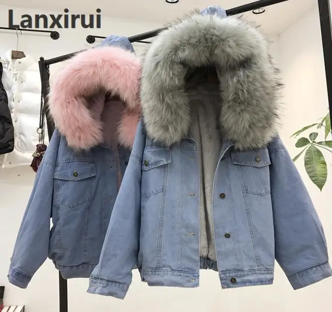 Новинка зимы 2021, джинсовое пальто из овечьей шерсти с большим меховым воротником, теплое пальто, модная женская уличная Студенческая одежда, размер S-XL