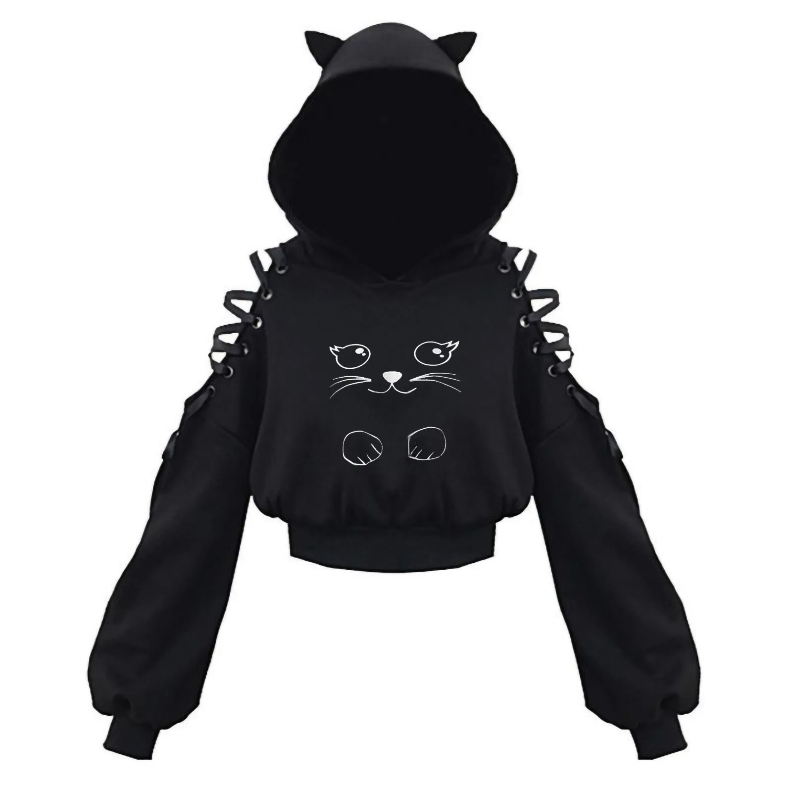 40 # Harajuku Толстовка для женщин в стиле панк, готика Толстовка осень-зима плюс бархат с вырезами на шнуровке с длинным рукавом толстовки с милыми кошачьими ушками