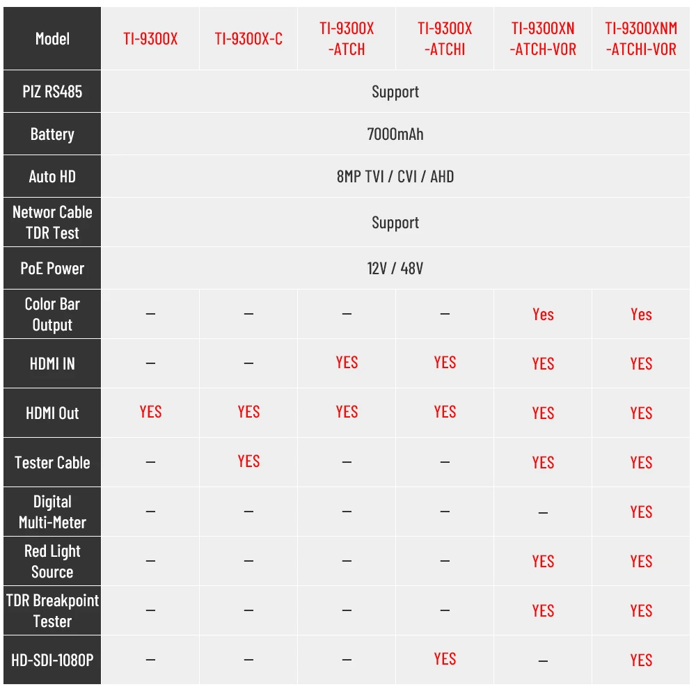 TI-9300X: аналоговый + сетевой тестер камеры + HDMI выход + 4 вида выходной мощности 5 В/12 В/24 В/48 в TI-9300X-ATCH: аналоговый + сетевой + CVI/TVI/AHD + HDMI In/ out + 4 вида выходных источников питания 5 В/12 В/24 В/48 в TI-9300X-ATCHI: аналоговый + сетевой + CVI/TVI/ AHD/ SDI + HDMI in/outpoe + 4 вида выходной мощности 5 В/12 В/24 В/48 в TI-HT9300: аналоговый + сетевой + CVI/ TVI/ AHD + линейный охотничий + TDR точка останова + красный источник света + оптический измеритель мощности + цветной бар выход + HDMI вход/выход + poe + 4 вида выходной мощности 5V/ 12V/ 24V/ 48V TI-HT9300S-M: аналоговый + сетевой + CVI/ TVI/ AHD/ SDI + мультиметр + линейный охотничий + TDR точка останова + красный источник света + оптический измеритель мощности + Цветовая полоса выхода + HDMI вход/выход + poe + 4 виды выходная мощность 5V / 12V/ 24V/ 48V