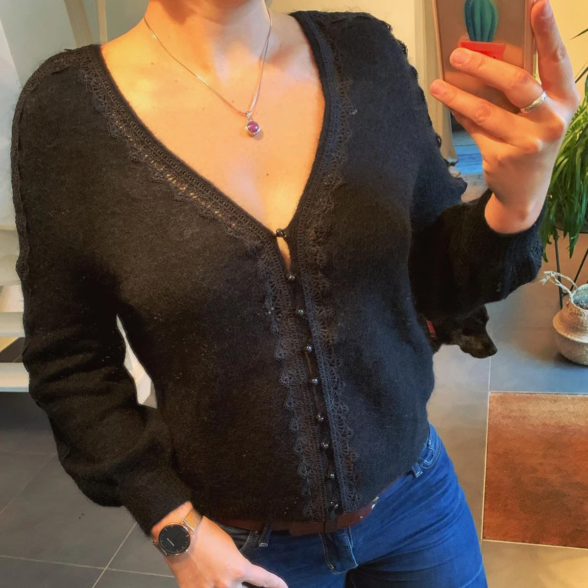 Женский винтажный кардиган с кружевными вставками, теплый повседневный джемпер с пышными рукавами и V-образным вырезом, Осень-зима 2021